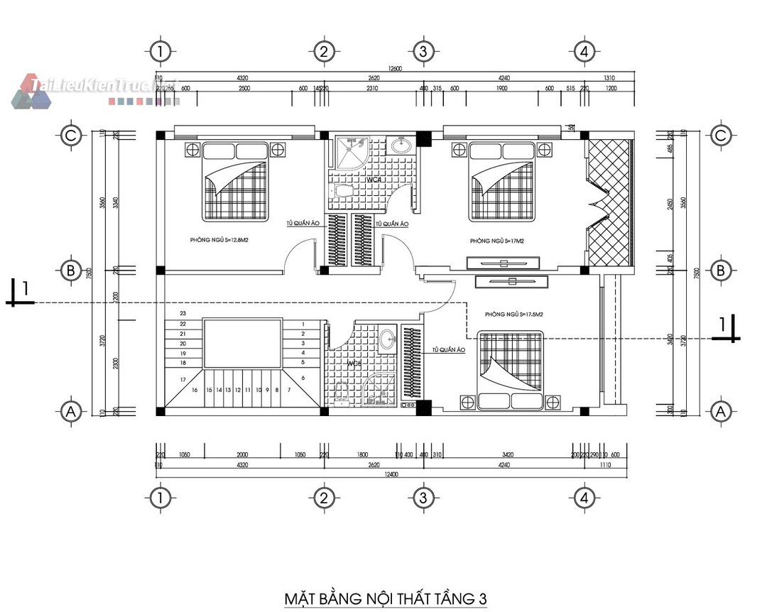 Tầng 3: 03 Phòng ngủ tiêu chuẩn (12.8m2, 17m2 và 17.6m2) với vệ sinh chung/khép kín.