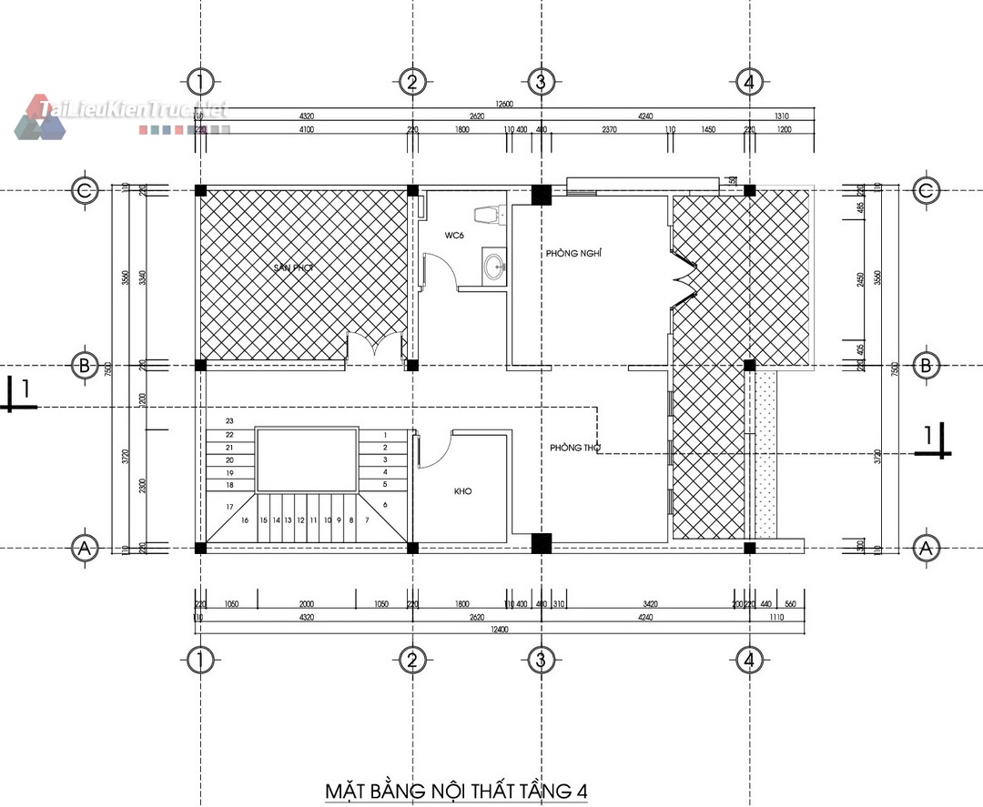 Tầng 4: Phòng Thờ, Phòng Nghỉ (Phòng Giặt/Kho), Sân Thượng rộng thoáng.