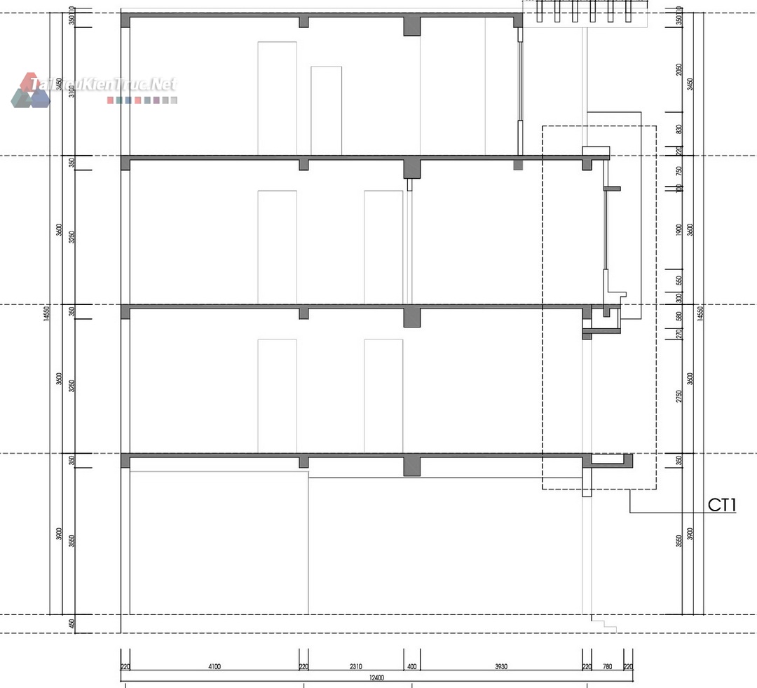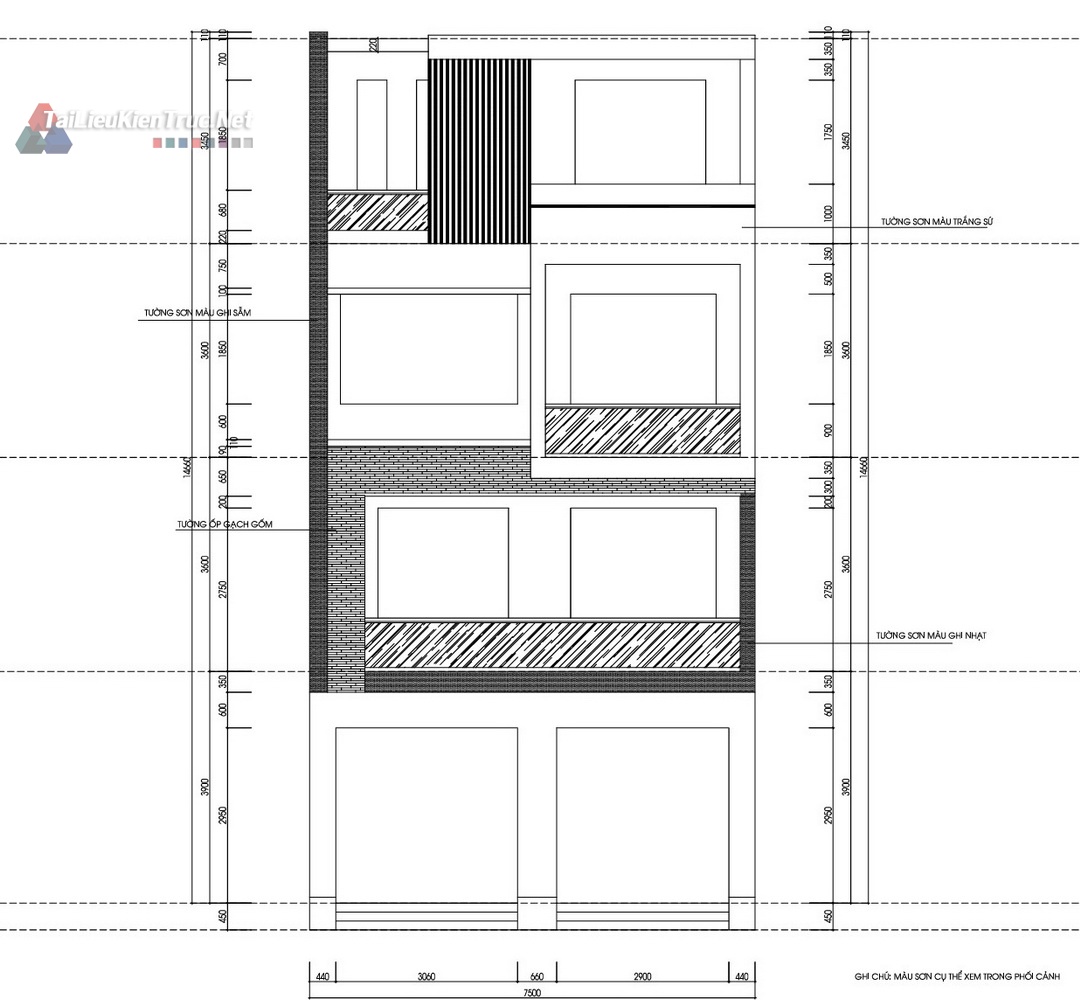 Kiến trúc: Chi tiết mặt bằng, mặt đứng, mặt cắt, chi tiết cửa, thang, vệ sinh... (Minh họa qua các bản vẽ Mặt bằng nội thất Tầng 1, Tầng 2, Tầng 3, Tầng 4 và Mặt đứng).