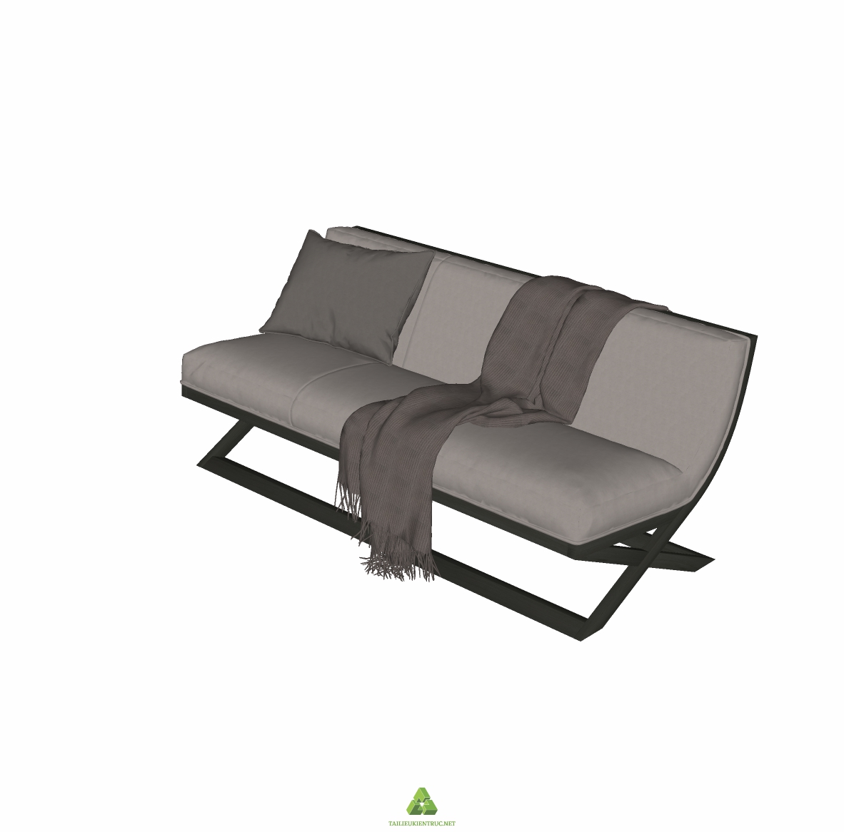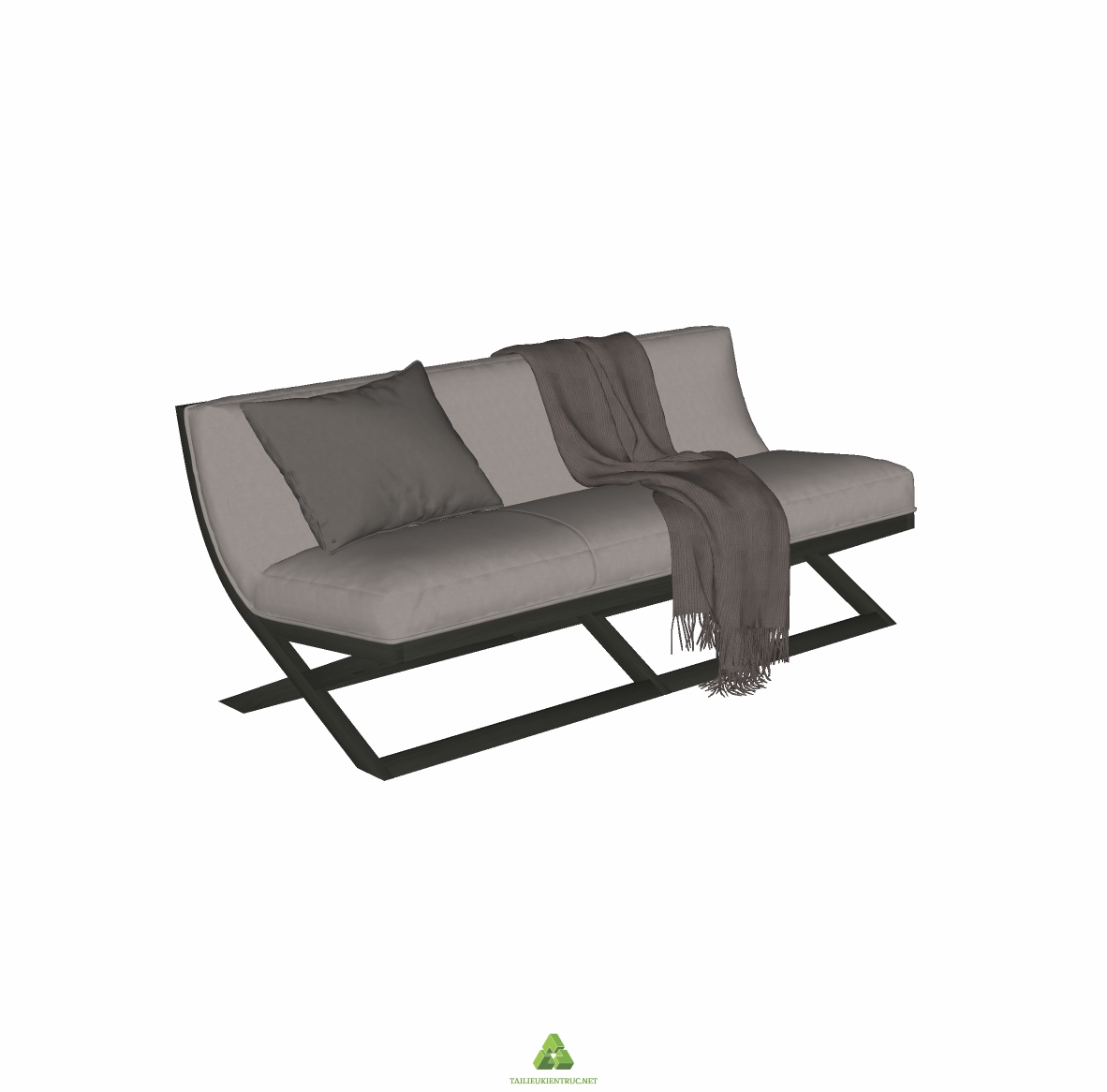 Hình ảnh thứ hai cho thấy chi tiết của ghế sofa, nổi bật bởi chân kim loại đen chắc chắn, tạo nên vẻ ngoài vững chãi và mạnh mẽ cho sản phẩm. Chất liệu vải mềm mại, đi kèm với ghối tựa lưng êm ái và thêm một chi tiết là tấm chăn mỏng tạo nên sự ấm áp.