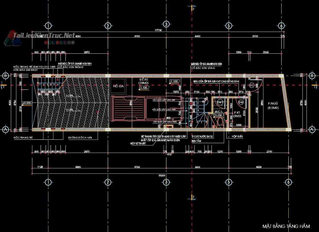 Thay vì lấn chiếm không gian tầng trệt làm gara, kiến trúc sư đã khéo léo thiết kế tầng hầm (độ cao -1.100).