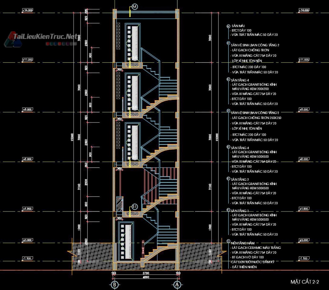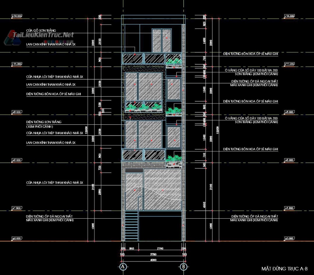 Qua bản vẽ mặt đứng, có thể thấy ngôi nhà mang đậm ngôn ngữ kiến trúc xanh. Các ban công được bố trí bồn hoa chạy dài, kết hợp cùng hệ thống nan bê tông và kính cường lực tạo nên vẻ ngoài thanh thoát, hiện đại. Việc sử dụng đá Granite màu đen và xám ghi nhấn nhá giúp công trình bền bỉ với thời gian và không bao giờ lỗi mốt.