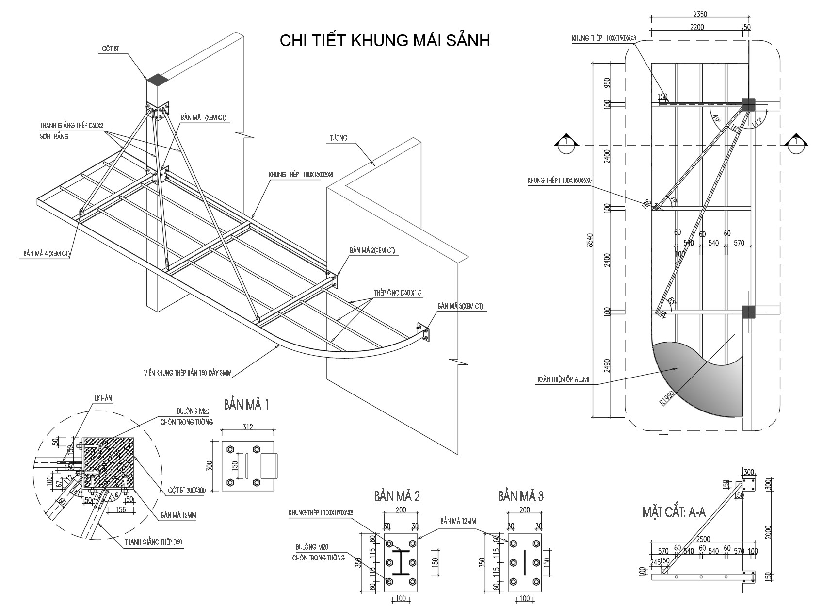 - Các chi tiết gắn kèm như bản mã, thanh giằng thép, và các yếu tố cố định khác đều được chú thích và kích thước cụ thể.