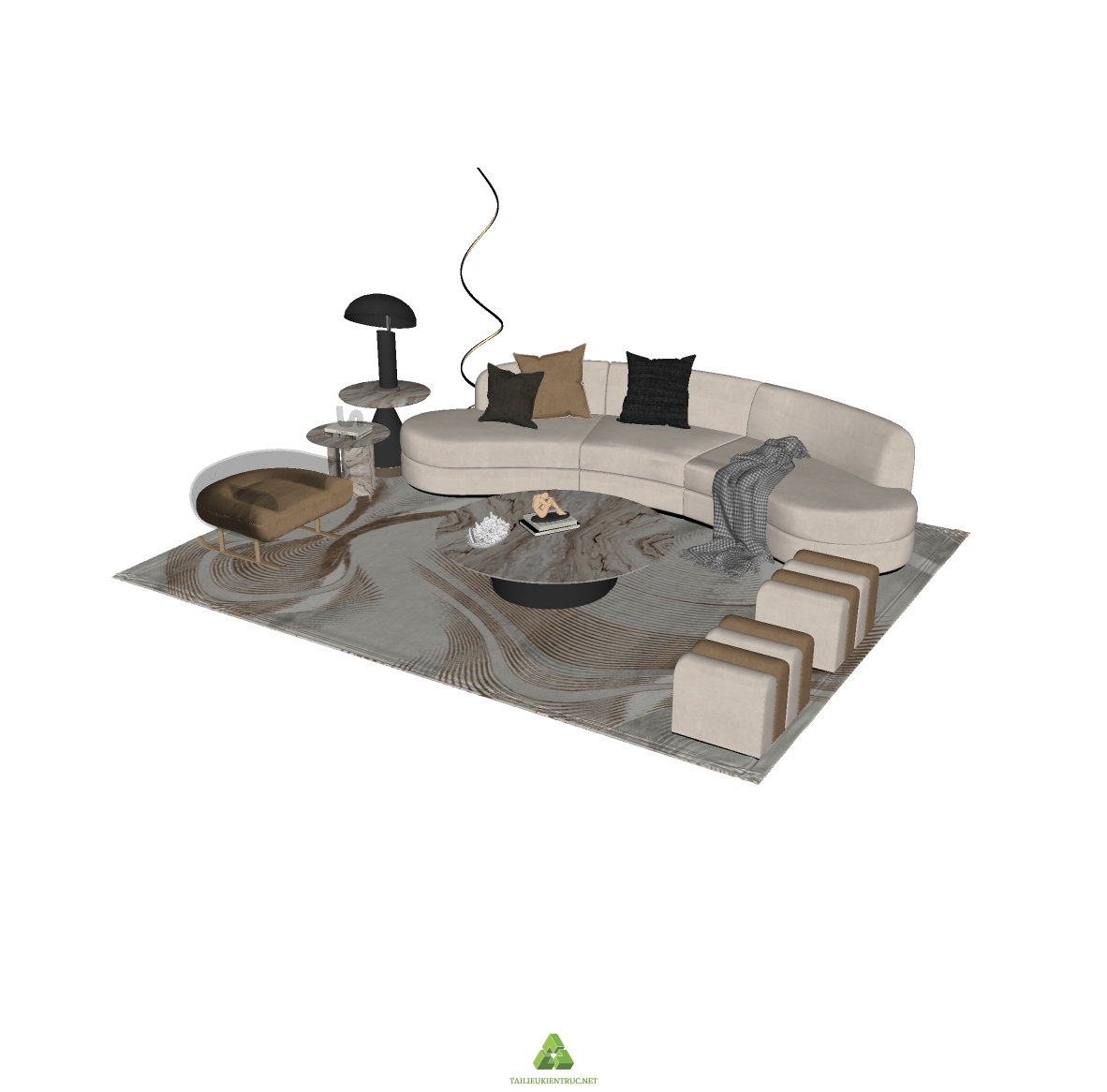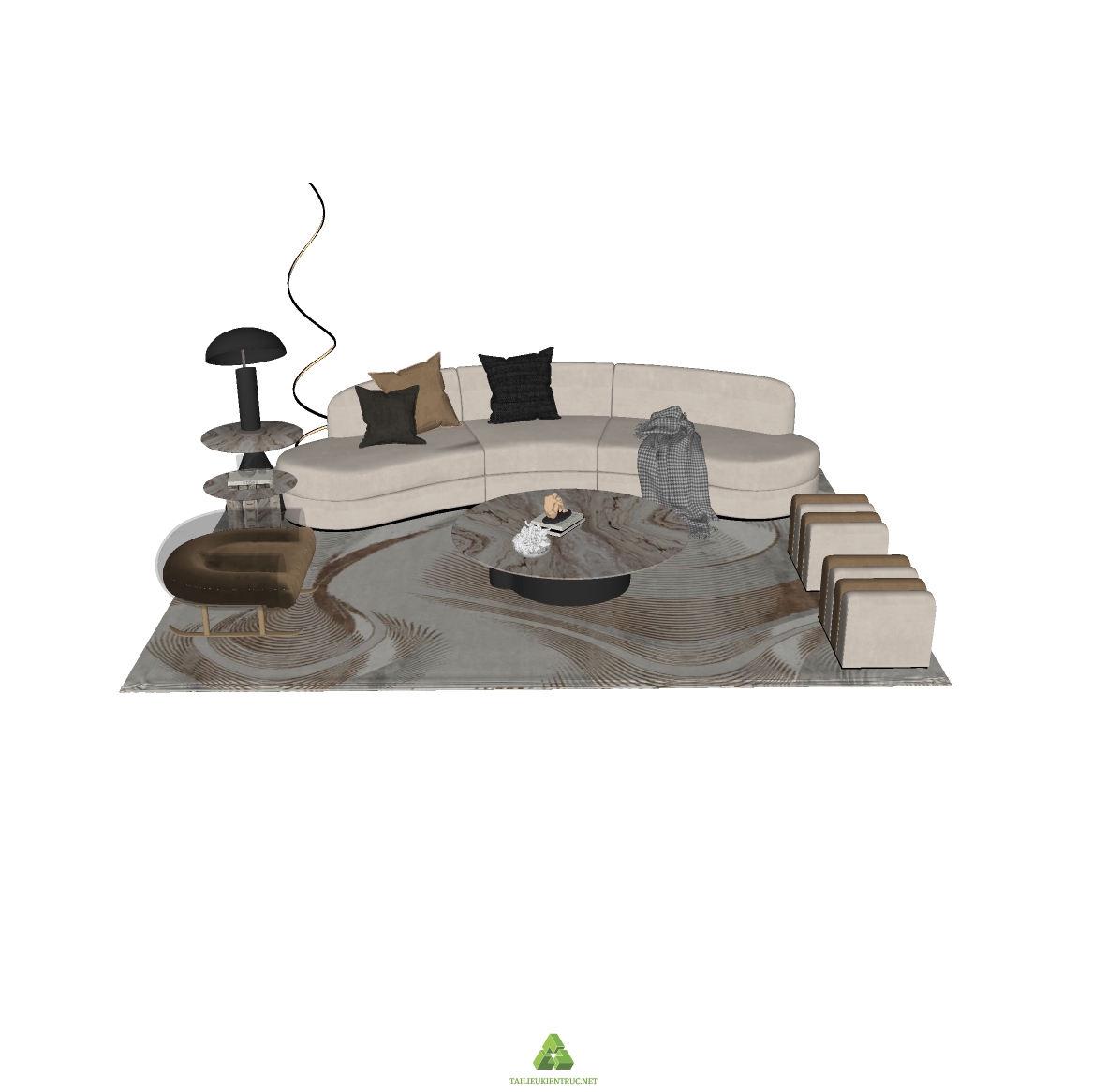 Hình ảnh đầu tiên mô tả một phòng khách tinh tế với bộ ghế sofa hình vòng cung màu kem, đối diện với một bàn trà đá cẩm thạch. Ghế bành màu nâu kết hợp với những chiếc ghế đôn nhỏ tạo thành một không gian ngồi lý tưởng cho các buổi gặp gỡ bạn bè hoặc gia đình. Một chiếc đèn sàn với thiết kế độc đáo và một chiếc bàn phụ nhỏ nhấn mạnh phong cách hiện đại. Tấm thảm trải sàn màu sắc nhẹ nhàng, hòa quyện với tổng thể không gian.