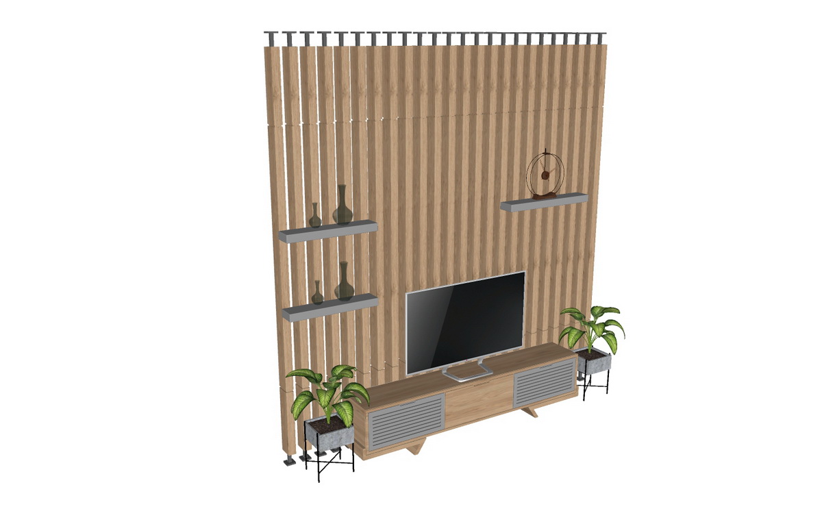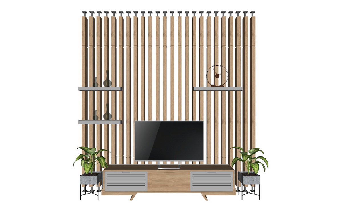 Sản phẩm còn được trang bị một kệ tivi đơn giản nhưng hiệu quả, phía trên là các ngăn kệ nhỏ có thể sử dụng để đặt các vật trang trí như bình hoa, sách hay các thiết bị điện tử khác. Hai bên kệ tủ được bố trí thêm chậu cây cảnh, giúp không gian thêm xanh mát và gần gũi với thiên nhiên.