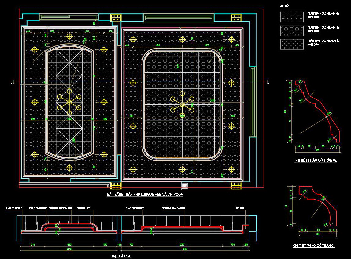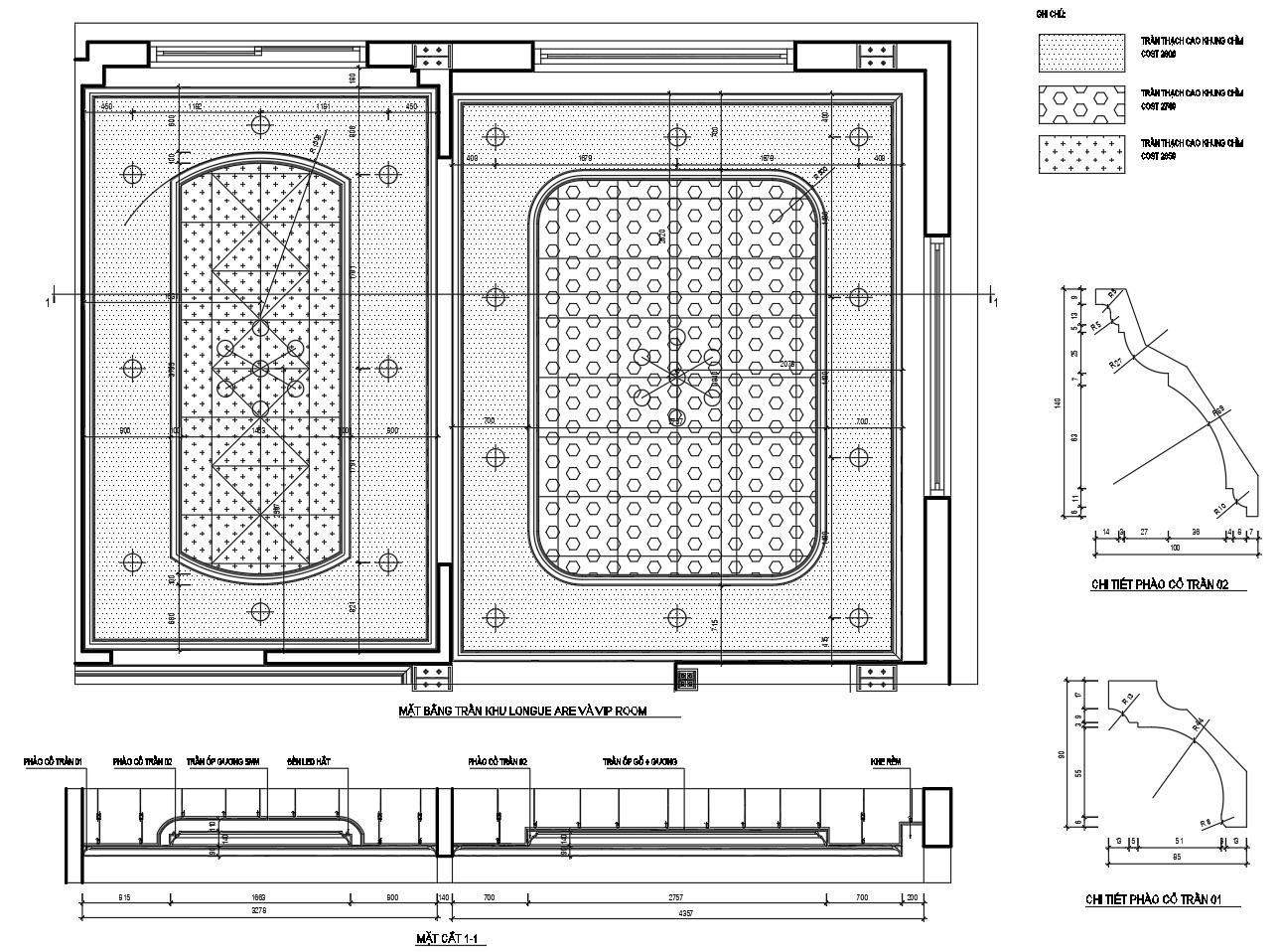 Trong hình ảnh, bản vẽ chi tiết mô tả cấu trúc và thiết kế của trần các khu vực phòng khách và VIP, gồm các chi tiết kỹ thuật và kích thước cần thiết. Các bản vẽ này không chỉ cung cấp cái nhìn sâu sắc vào thiết kế tổng thể mà còn tập trung vào các yếu tố chính như chi tiết phào chỉ và cấu trúc bên trong.
