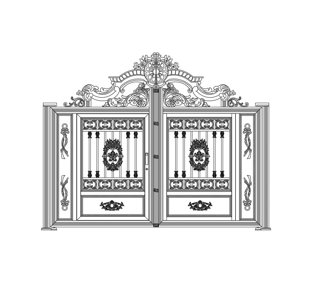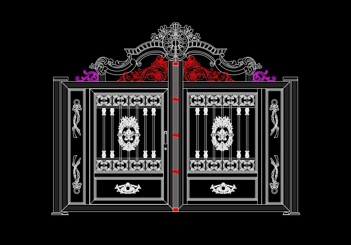 Các hình ảnh trên cho thấy một bản vẽ CAD chi tiết của một mẫu cổng được thiết kế theo phong cách tân cổ điển với các chi tiết hoa văn tinh xảo và bố cục cân đối. Cổng được thiết kế hai cánh, cùng với những họa tiết hoa lá đối xứng nhau, tạo nên một vẻ đẹp hài hòa nhưng không kém phần uy nghi và sang trọng.
