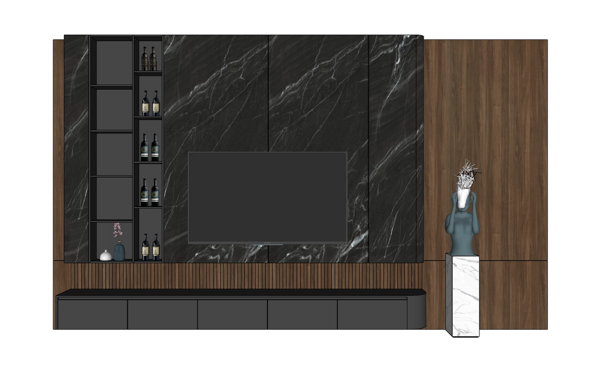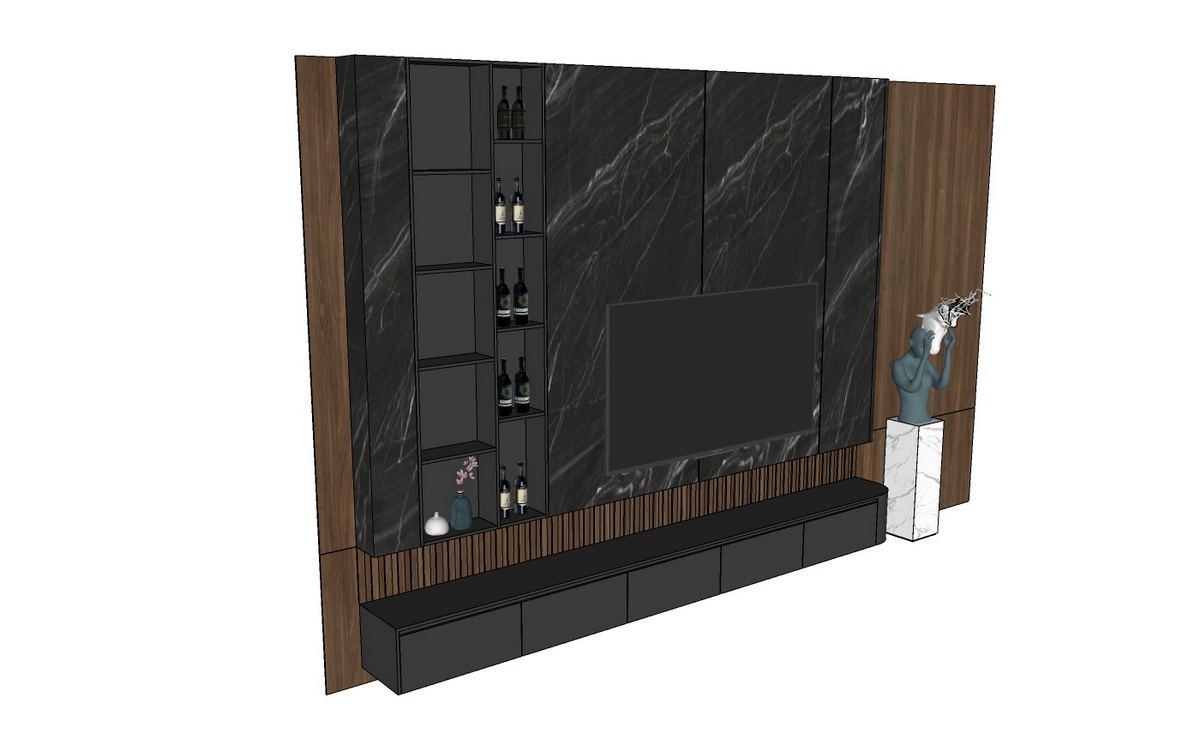 Thiết kế bao gồm một kệ tivi tích hợp hệ thống kệ mở, tiện lợi cho việc bày trí các vật dụng trang trí hoặc lưu trữ rượu vang. Các bức hình cho thấy sự kết hợp khéo léo giữa các yếu tố hiện đại và cổ điển, đặc biệt là tác phẩm điêu khắc nghệ thuật đặt cẩn thận bên cạnh, tôn lên vẻ đẹp của cả bộ kệ.
