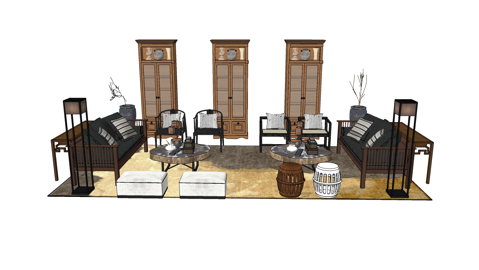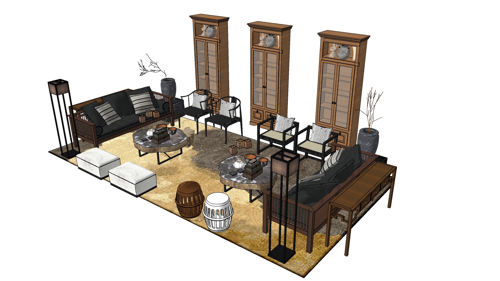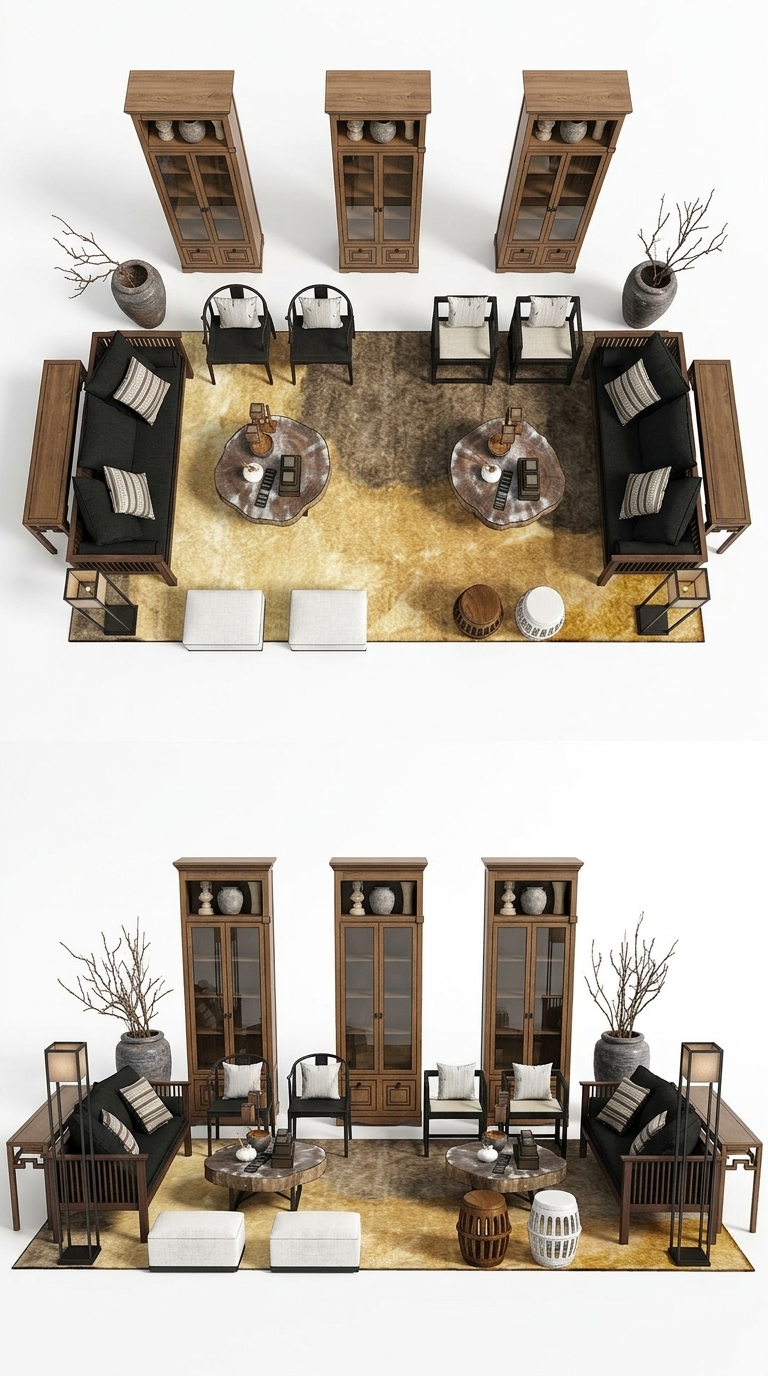 Hình ảnh cho thấy một thiết kế phòng khách với các yếu tố đặc trưng của nội thất Á Đông. Sử dụng kết hợp giữa gỗ tối màu và các vật liệu tự nhiên, không gian này tạo cảm giác ấm cúng và thanh lịch. Bộ sofa và ghế tựa có kiểu dáng cổ điển cùng với các chi tiết trang trí thủ công, nhấn mạnh tinh thần truyền thống.