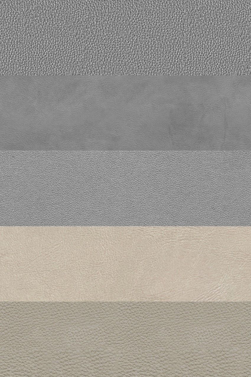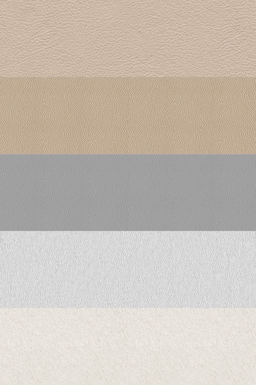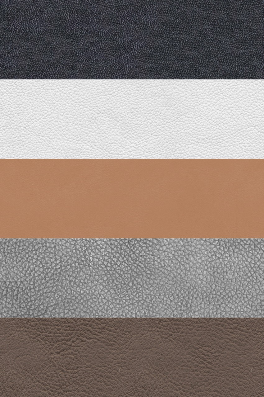 Những mẫu da này đại diện cho một loạt các lựa chọn về màu sắc, từ những tông màu trung tính như nâu, đen, xám, đến các sắc thái tươi sáng hơn như trắng và nâu vàng. Mỗi mẫu đều thể hiện rõ độ bóng, hoa văn, và kết cấu của chất liệu da, tạo nên sự phong phú trong thiết kế.
