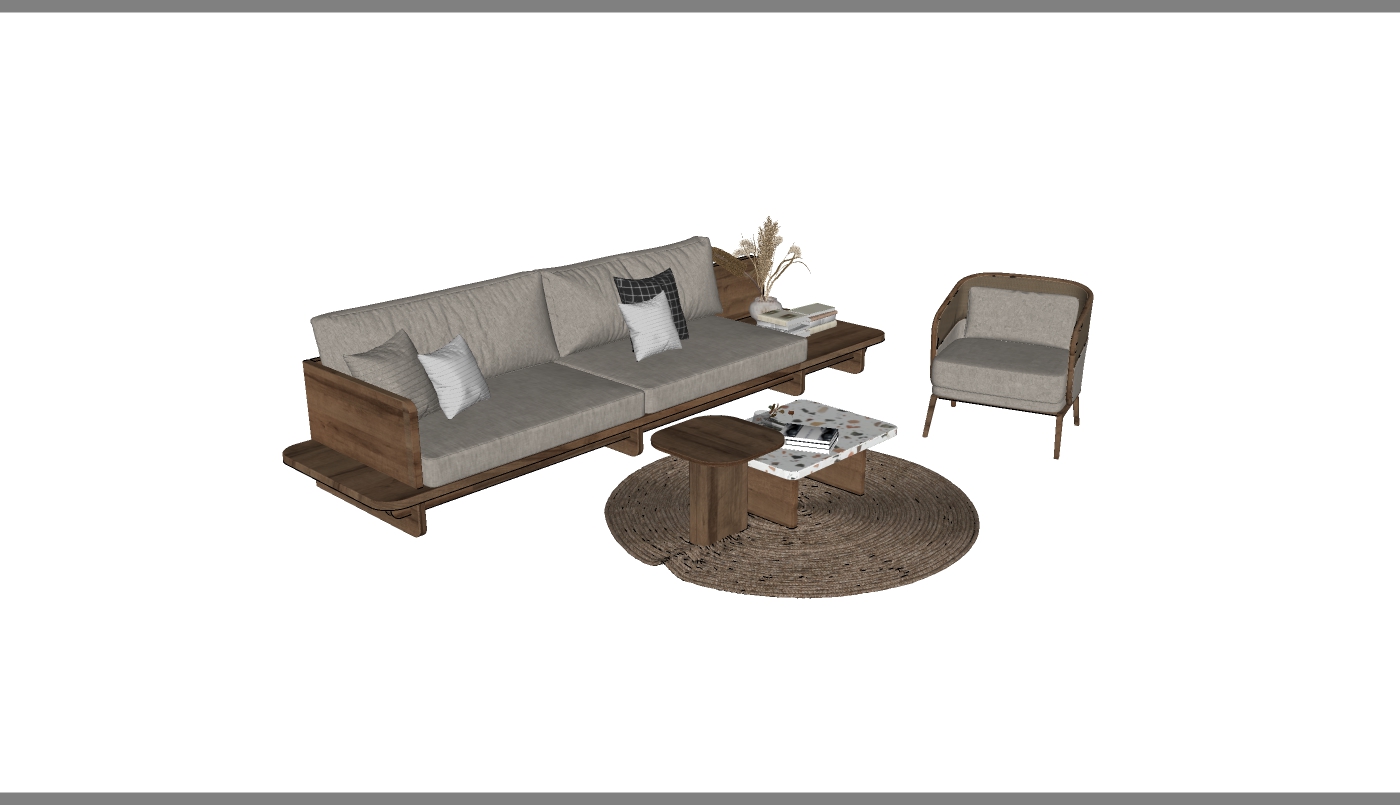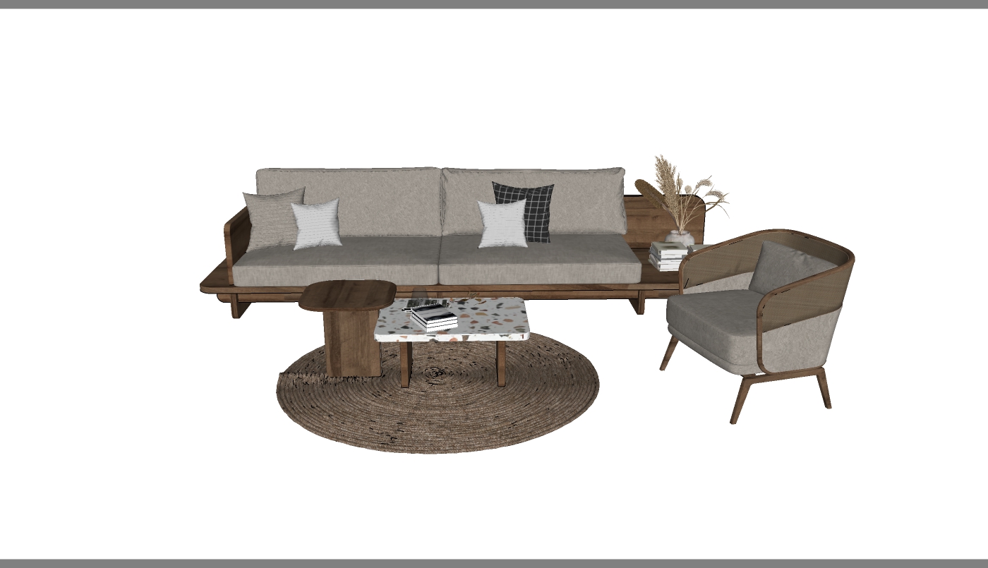 Nhìn vào hình ảnh, chúng ta thấy một bộ ghế sofa với phong cách hiện đại, kết hợp cùng ghế bành và bàn trà, tạo nên một không gian phòng khách sang trọng và tiện nghi. Các mảng màu trung tính như xám, nâu và trắng mang đến sự hài hòa và dễ chịu cho mắt.
