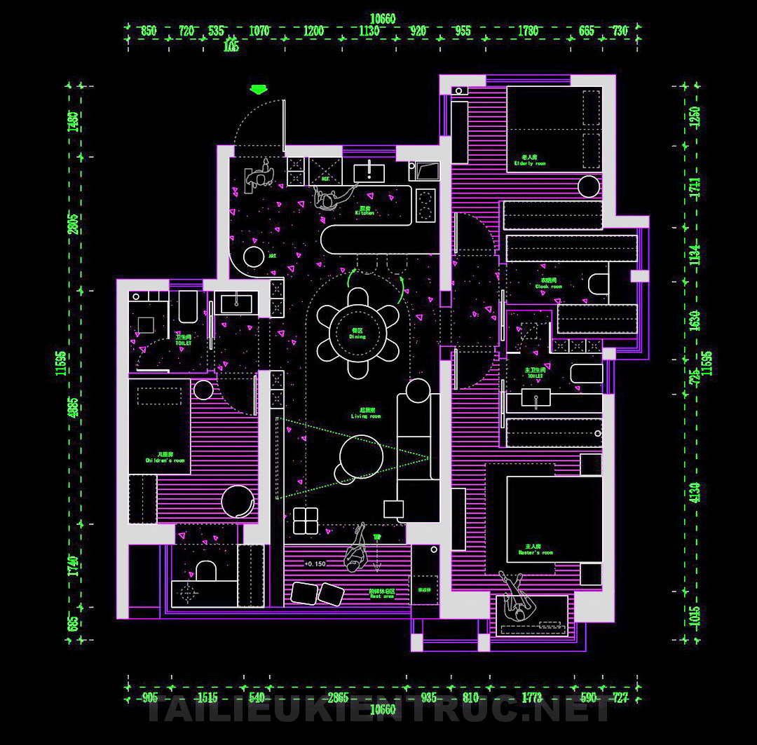Bản vẽ thiết kế căn hộ bao gồm các phòng chức năng chính như phòng khách, phòng ăn, phòng ngủ master, phòng trẻ em, cùng với các khu vực như nhà vệ sinh và bếp. Sự sắp xếp các không gian này được thực hiện một cách hợp lý giúp tối ưu hóa diện tích sử dụng, đồng thời tạo sự liên kết thuận tiện giữa các phòng.