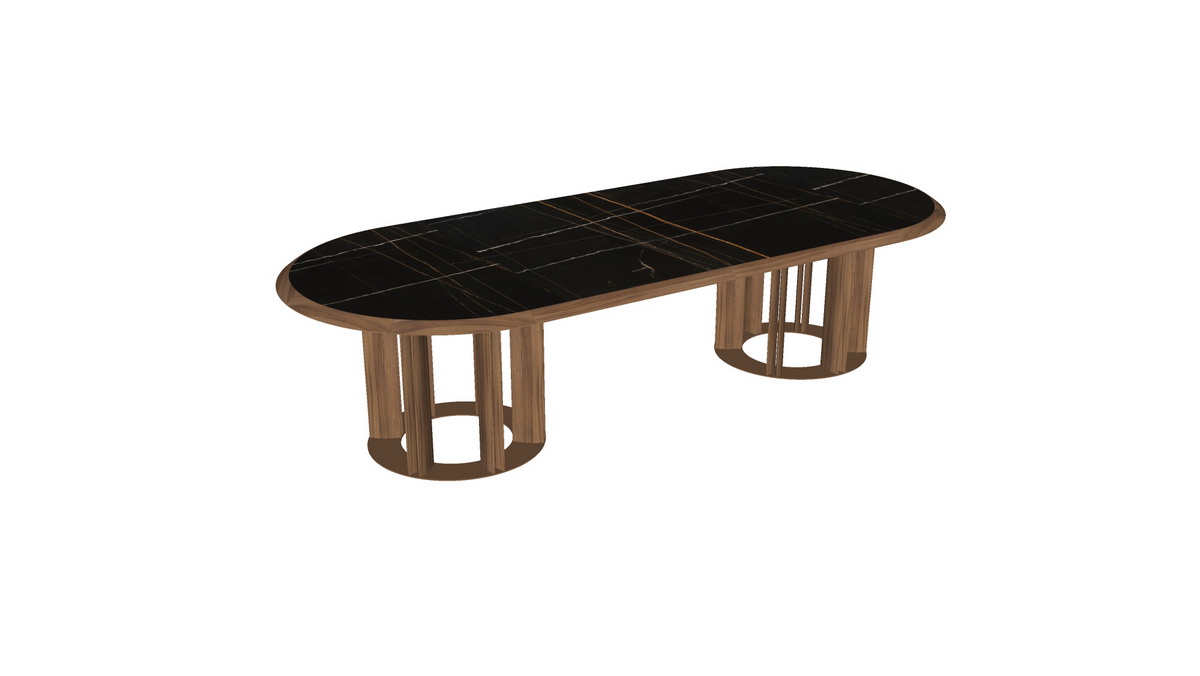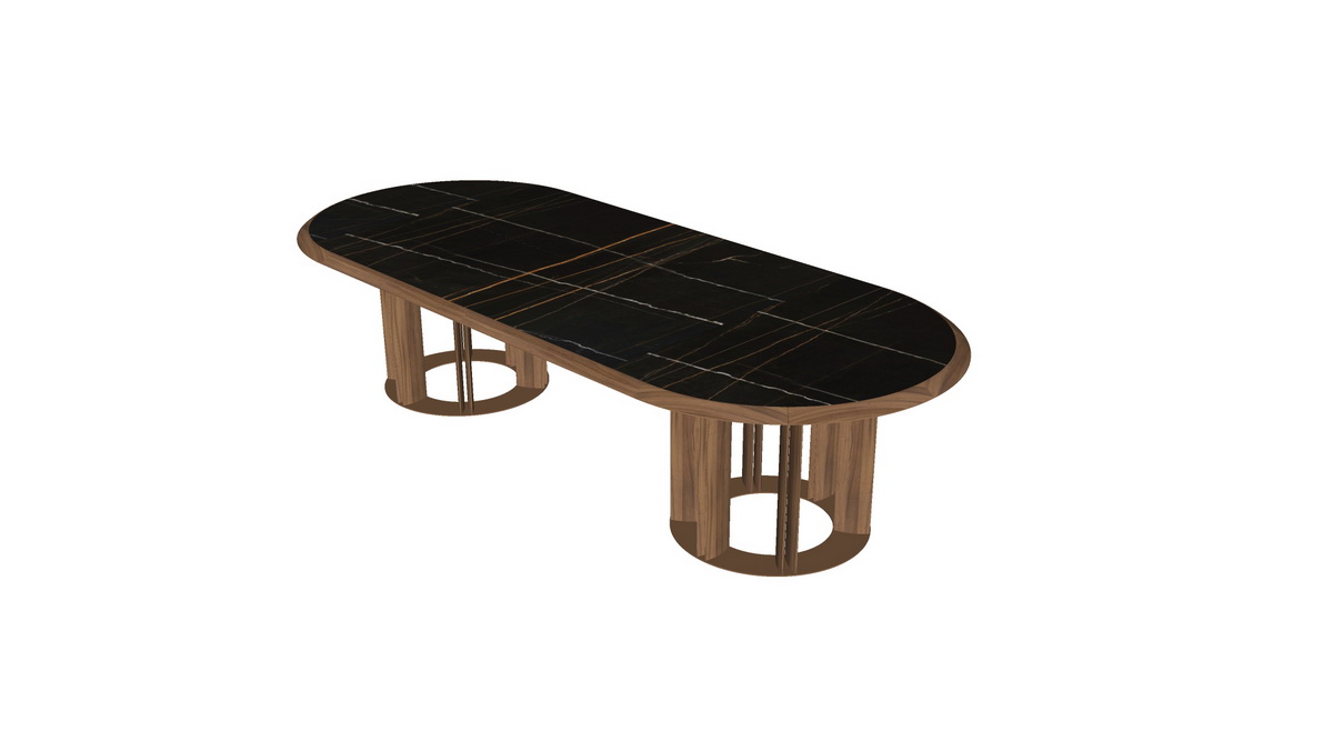 Chiếc bàn này có thiết kế độc đáo với mặt bàn hình oval, tạo nên sự mềm mại và hài hòa cho tổng thể không gian. Chất liệu chủ đạo là đá cẩm thạch đen kết hợp với những đường vân tinh tế, sắc vàng óng ánh, tạo nên điểm nhấn sang trọng và đầy cuốn hút.