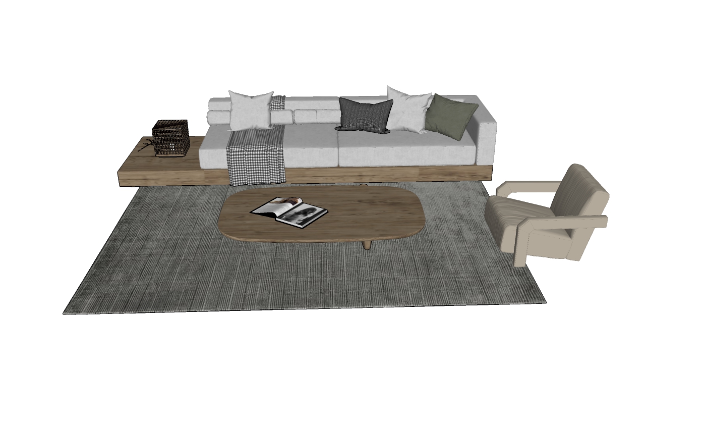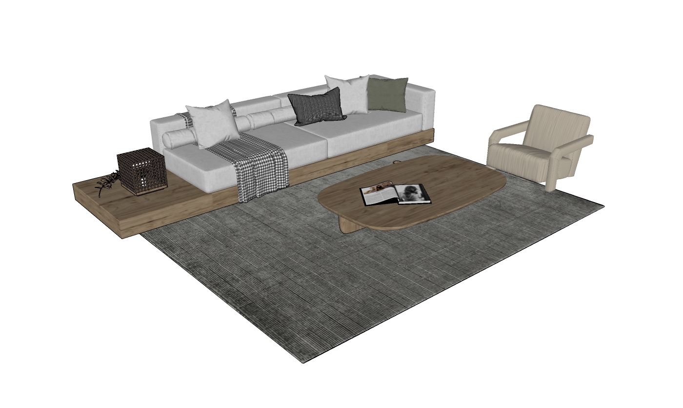 Mẫu thiết kế này bao gồm một bộ sofa kết hợp giữa chất liệu gỗ và vải, tạo nên sự thoải mái và trang nhã cho phòng khách. Bộ sản phẩm bao gồm một ghế sofa dài, một chiếc bàn nhỏ và một ghế đơn, tất cả được đặt trên một tấm thảm lớn.