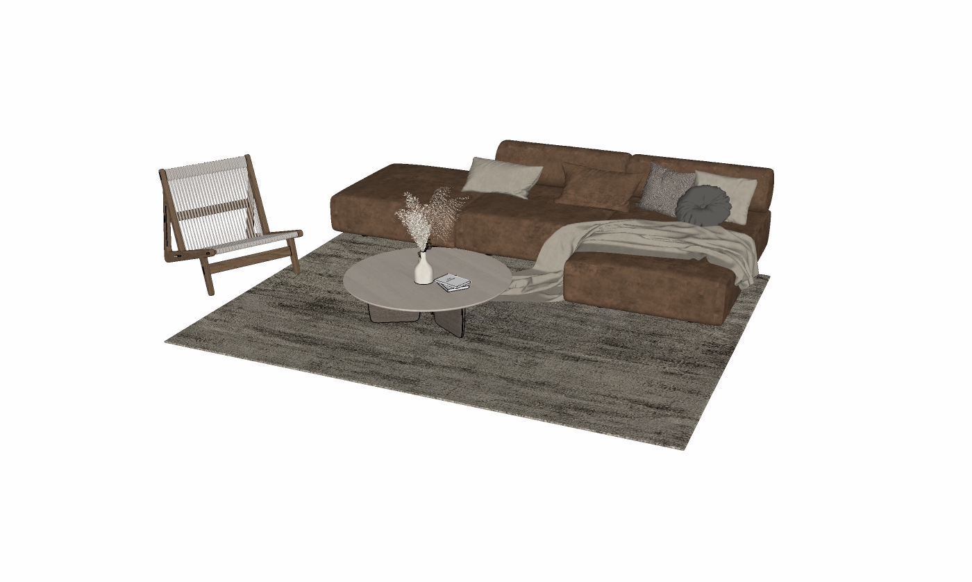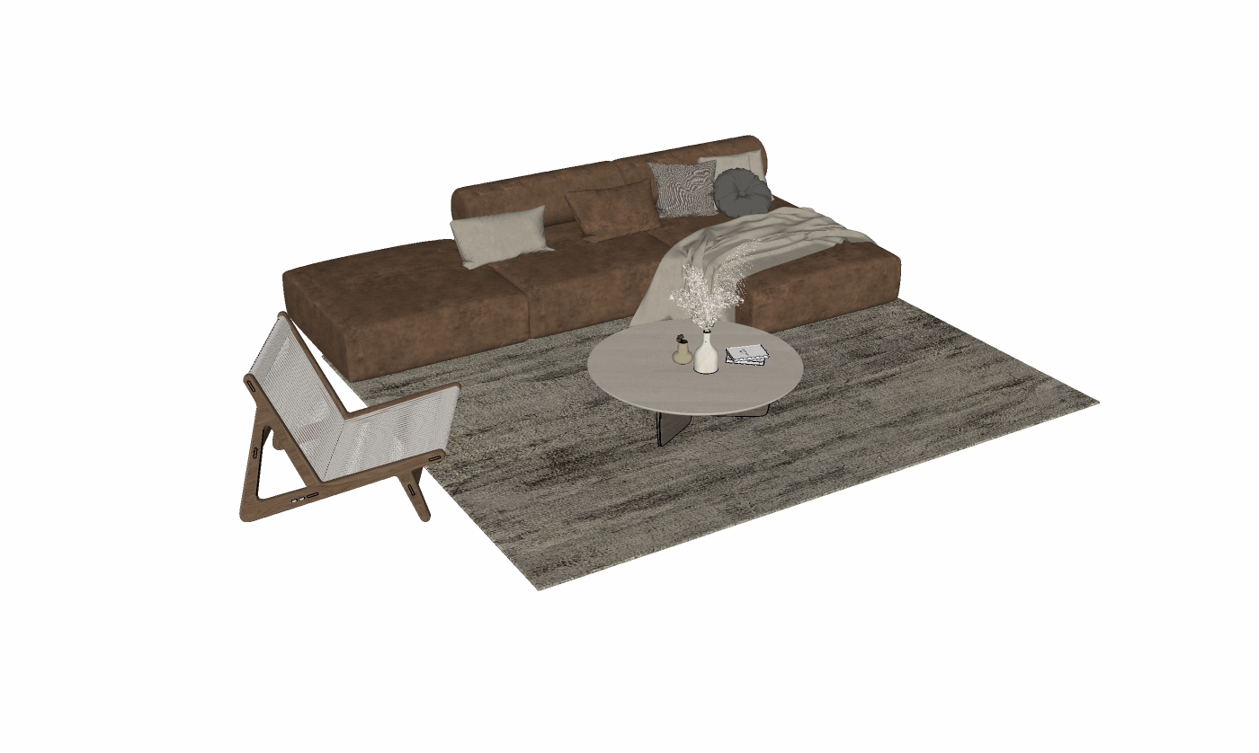 Bộ sưu tập nội thất này gồm có một ghế sofa góc sang trọng, một chiếc ghế tựa phong cách và một bàn tròn hiện đại. Ghế sofa được bọc bằng vải màu nâu đất, tạo cảm giác ấm áp và gần gũi cho căn phòng. Từng chi tiết trên ghế đều được hoàn thiện một cách công phu, từ những chiếc gối đi kèm đến lớp chần bông mềm mại.