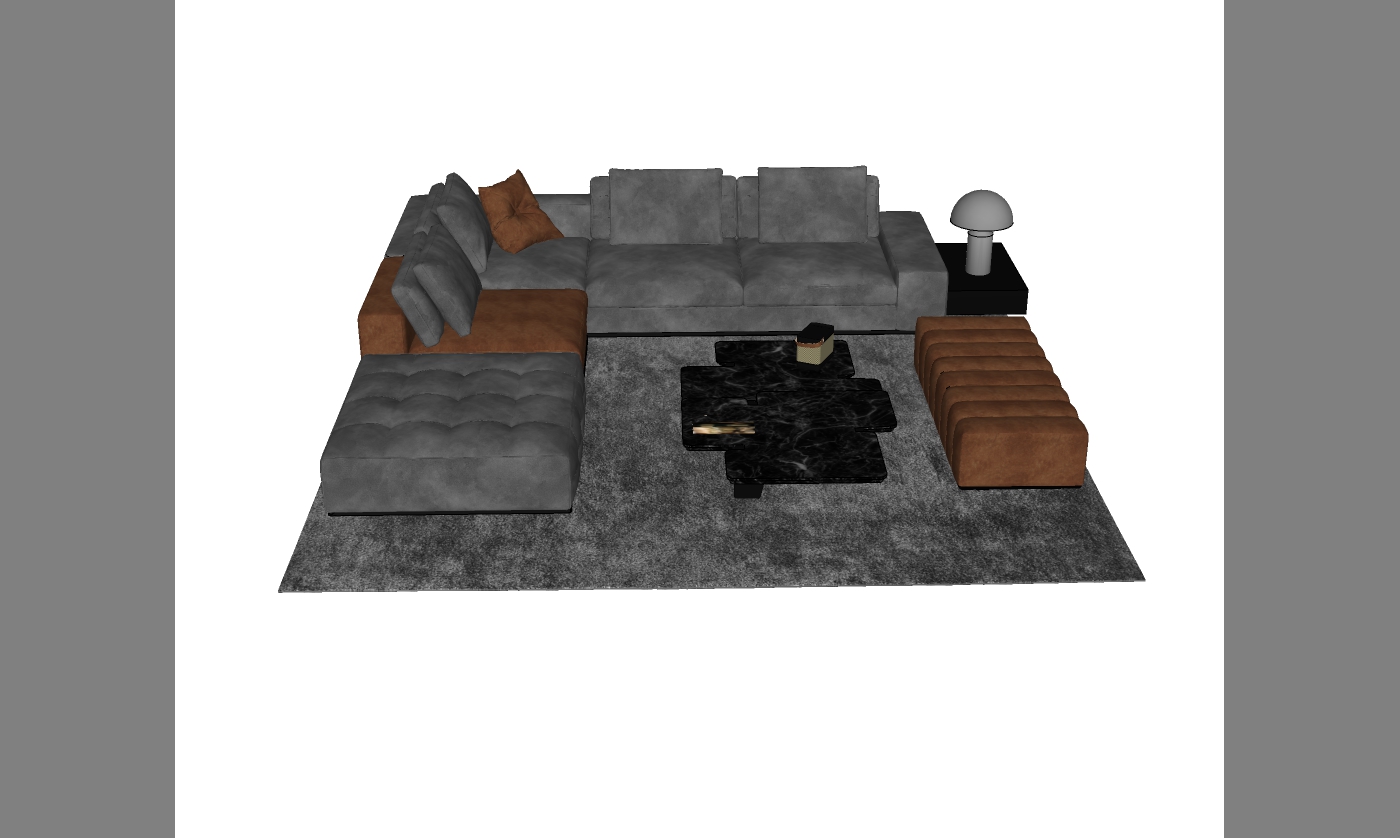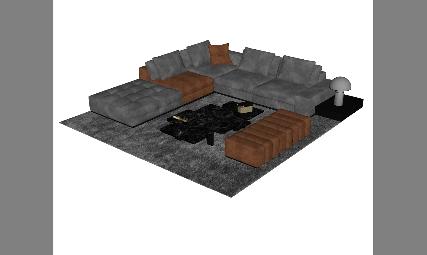 Mô hình thể hiện một không gian phòng khách với bộ ghế sofa hình chữ L được đặt trên một tấm thảm sàn màu xám, tạo nên sự hài hòa về màu sắc. Ghế được thiết kế với tone màu nâu và xám, chất liệu giả da và nỉ mang lại cảm giác êm ái và thoải mái.