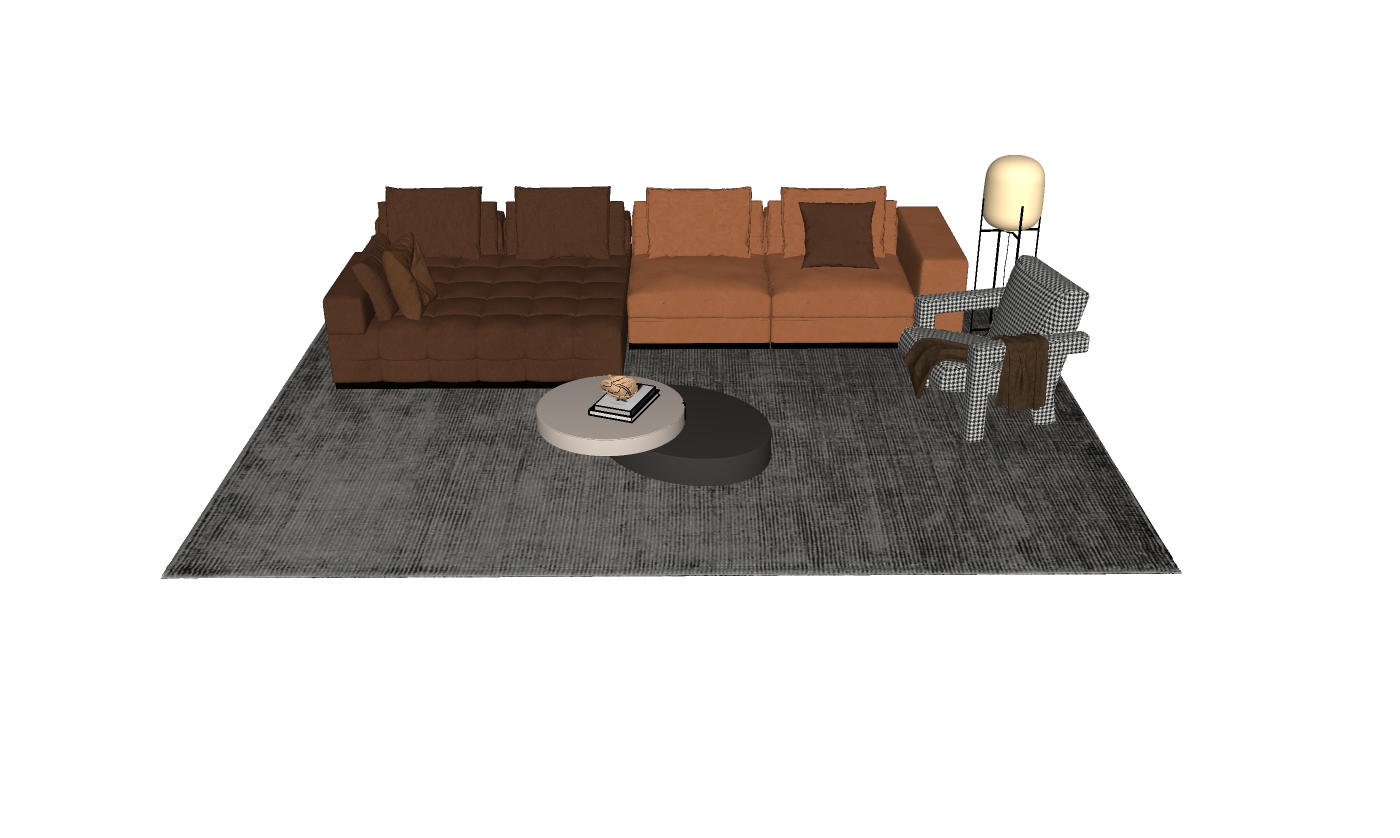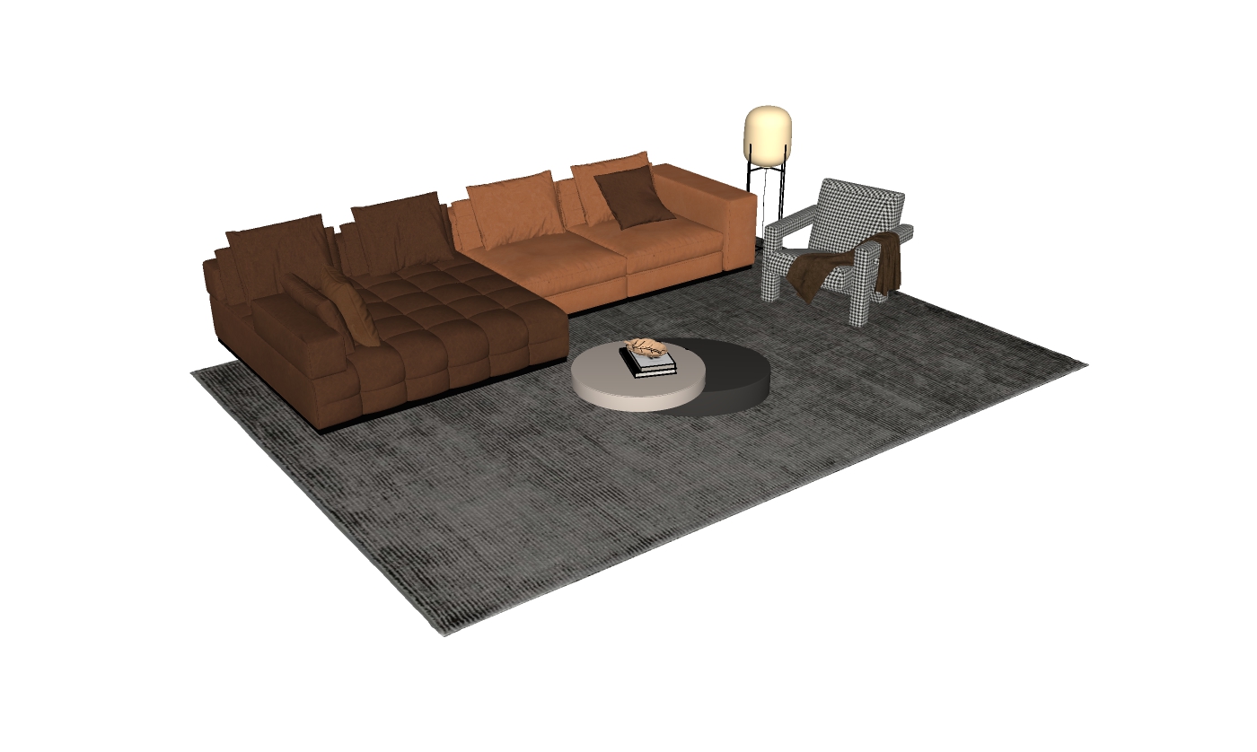 Mô hình này bao gồm một bộ sofa góc lớn, bàn trà đôi, ghế tay vịn và đèn đứng trên một tấm thảm trải rộng màu xám. Sử dụng tông màu nâu và cam đất, bộ sưu tập này tạo sự ấm cúng và hiện đại, phù hợp cho phòng khách hoặc không gian chờ.