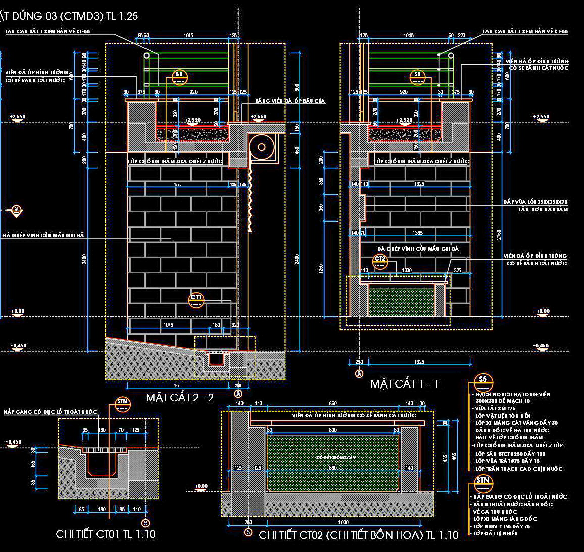 Ứng dụng thực tế của bản vẽ này rất đa dạng, từ việc sử dụng trong những dự án nhà ở dân dụng đến các công trình thương mại. Với kích thước và chi tiết vật liệu cụ thể như lan can sắt và viền đá ốp, sản phẩm này đảm bảo tính thẩm mỹ cùng độ bền cao khi được áp dụng vào thực tế.