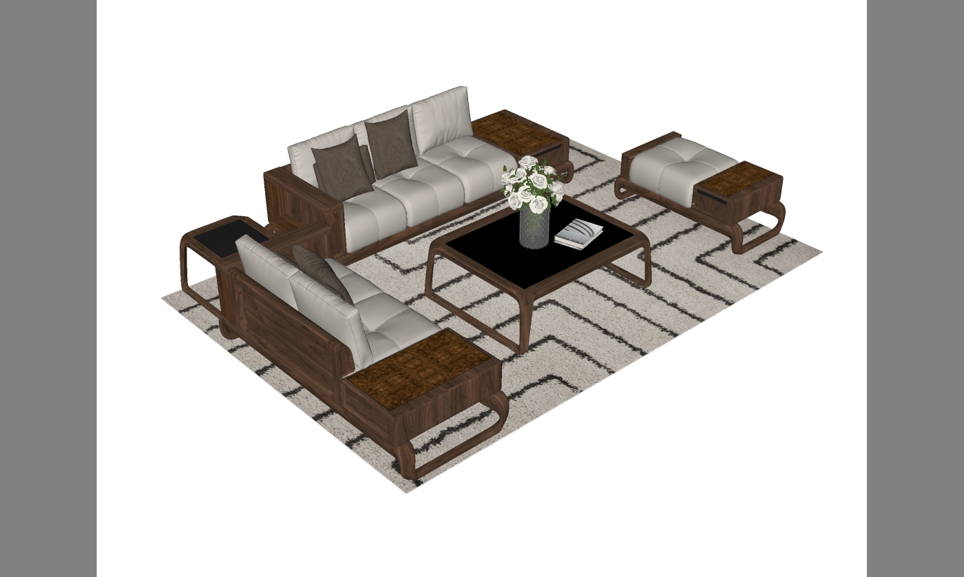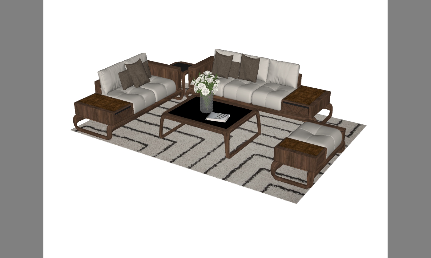 Mô hình này thể hiện một bộ ghế sofa được đặt trên một tấm thảm có hoa văn hình học tinh tế. Ghế và bàn chủ yếu làm từ gỗ với lớp đệm bọc nỉ màu trắng ngà, mang lại cảm giác thoải mái và sang trọng. Các chi tiết từ chân ghế đến tay vịn đều được thiết kế một cách tỉ mỉ, tạo nên sự hài hòa và phong cách cho không gian phòng khách.