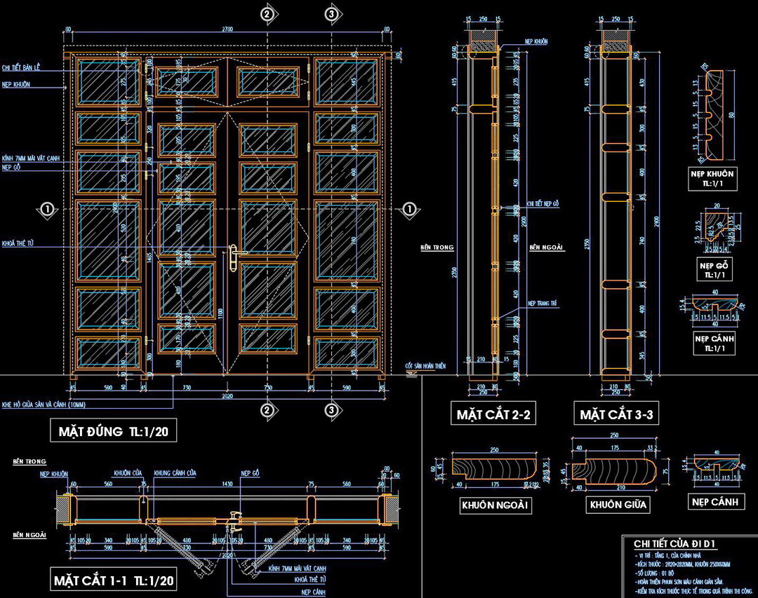 Trong hình ảnh, có các bản vẽ chi tiết về cửa gỗ kính với các phần cắt ngang và mặt đứng. Các bản vẽ được trình bày rõ ràng, chi tiết, minh hoạ cách lắp ráp và kích thước cụ thể từng thành phần của cửa, như khung cửa, nẹp khung, và vị trí kính. Đặc biệt, các mặt cắt cho thấy chi tiết từng lớp vật liệu và các điểm kết nối.