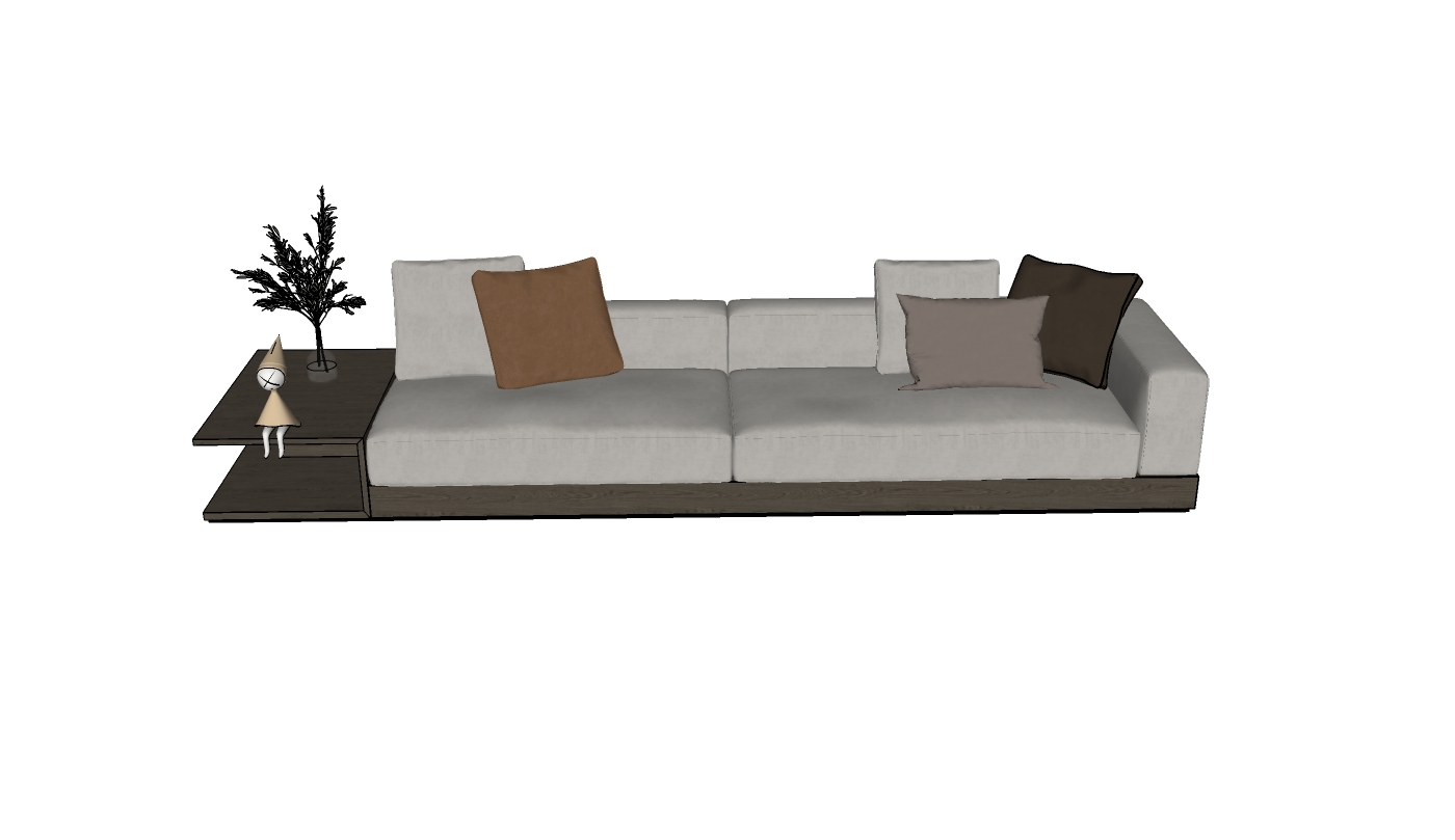 Mô hình ghế sofa trong hình ảnh mang đến sự kết hợp hài hòa giữa phong cách hiện đại và tiện nghi. Sản phẩm này có màu sắc trung tính, với các tông màu xám và nâu, phụ hợp cho mọi không gian sống. Thêm vào đó, thiết kế bao gồm một kệ nhỏ bên cạnh được trang trí bằng cây cối và đồ vật nhỏ, tạo điểm nhấn tinh tế.