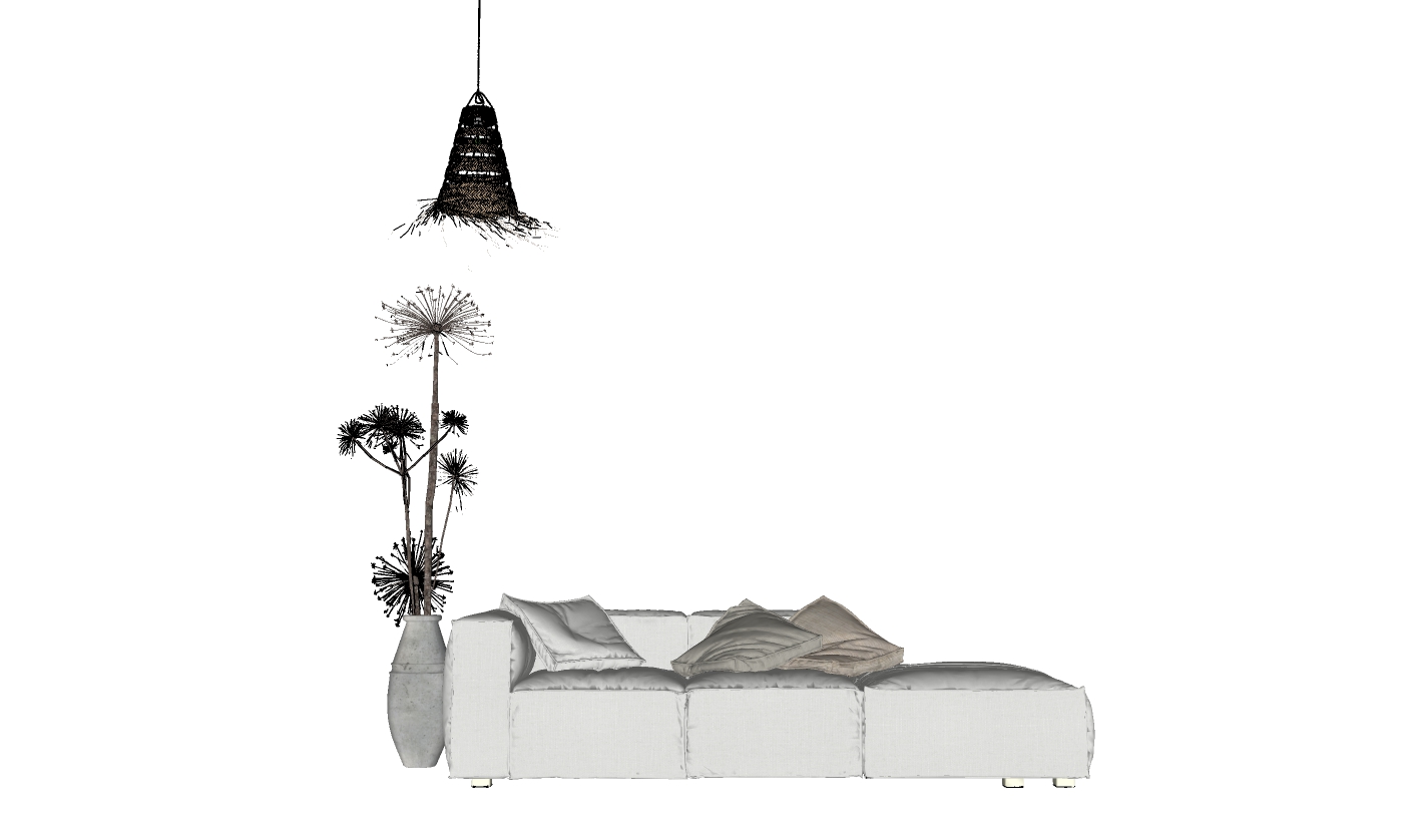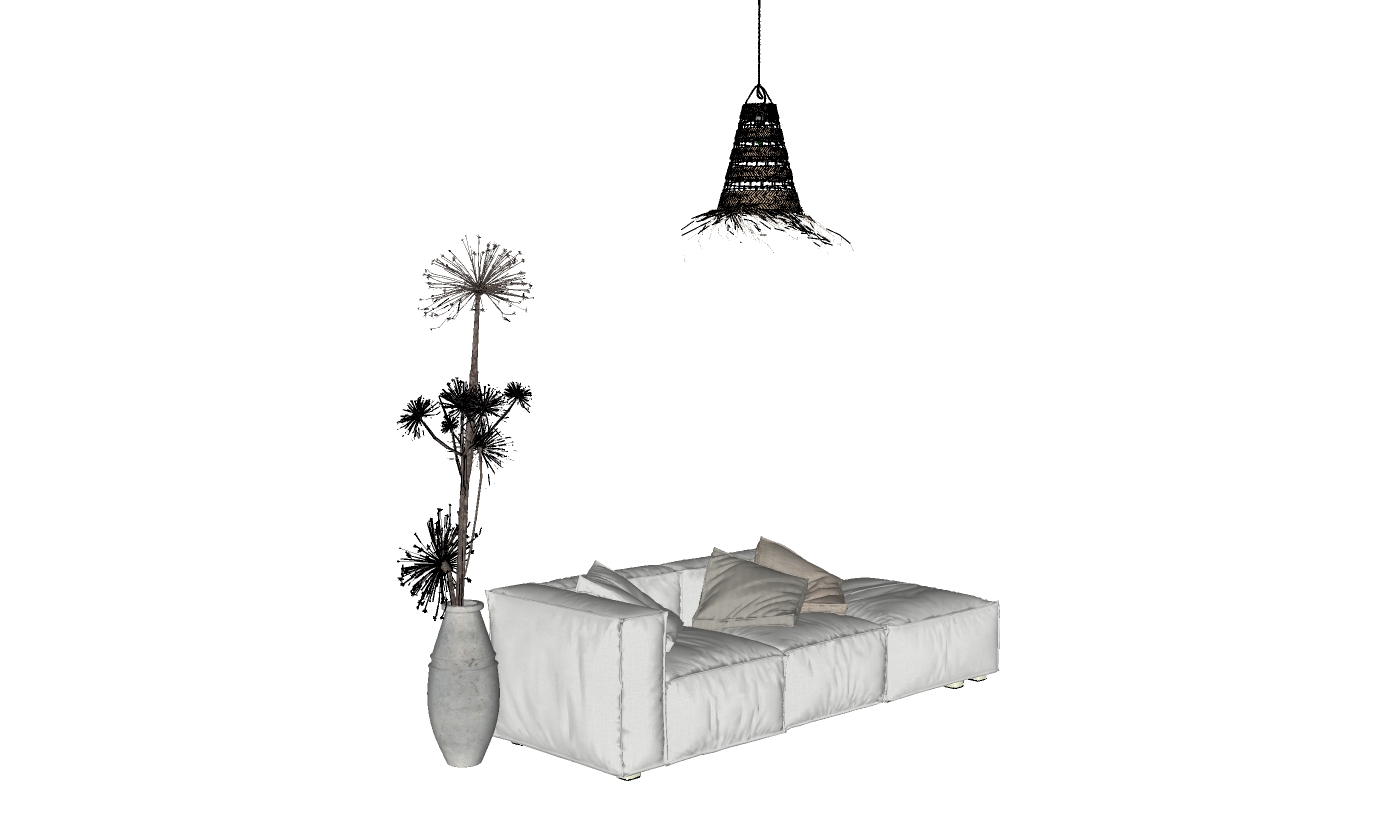 Trong hình ảnh, mô hình bao gồm một chiếc ghế sofa ba chỗ ngồi mang dáng vẻ hiện đại và đơn giản, toát lên vẻ sang trọng nhờ màu sắc trung tính và chất liệu vải mềm mại. Kèm theo đó là một chụp đèn treo kiểu dáng độc đáo kết hợp với một chậu cây trang trí, tạo nên một điểm nhấn ấn tượng trong không gian nội thất.