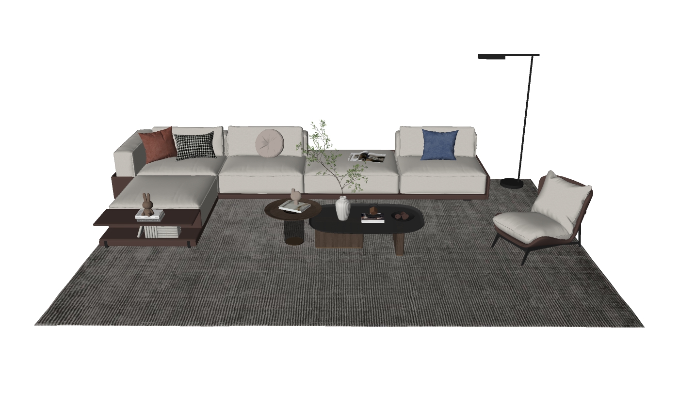 Mô hình bao gồm một bộ ghế sofa hiện đại màu xám nhạt với các gối tựa có nhiều màu sắc khác nhau như xanh dương, nâu cam và đen sọc caro, tạo điểm nhấn hài hòa cho không gian. Bên cạnh đó, có một chiếc ghế bành cùng tông màu, một đèn sàn đơn giản nhưng thanh lịch, và một bộ bàn cà phê với thiết kế độc đáo. Một thảm trải sàn tông màu xám đậm tạo sự gắn kết cho toàn bộ bố cục.