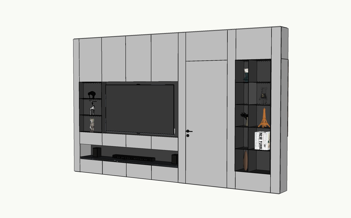 Trong hình ảnh, thiết kế tủ âm tường tích hợp với không gian dành cho tivi giúp tiết kiệm diện tích và tạo cảm giác gọn gàng, hiện đại. Chất liệu chủ yếu từ gỗ với bề mặt nhẵn mịn và màu sắc trung tính, thích hợp cho nhiều loại phong cách nội thất khác nhau. Phía trên tủ có nhiều ngăn tiện lợi để lưu trữ các đồ trang trí hoặc sách báo, tạo điểm nhấn thẩm mỹ cũng như tối ưu hóa không gian lưu trữ.
