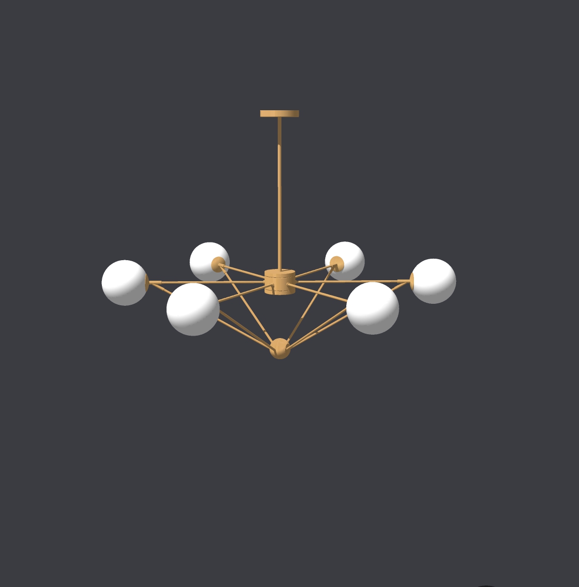 Thiết kế của đèn chùm được thể hiện qua hình ảnh với cấu trúc hình học độc đáo, sử dụng các thanh kim loại mảnh mai để kết nối các bóng đèn dạng cầu. Màu sắc chủ đạo là vàng đồng, tạo nên một cảm giác trang nhã và sang trọng.