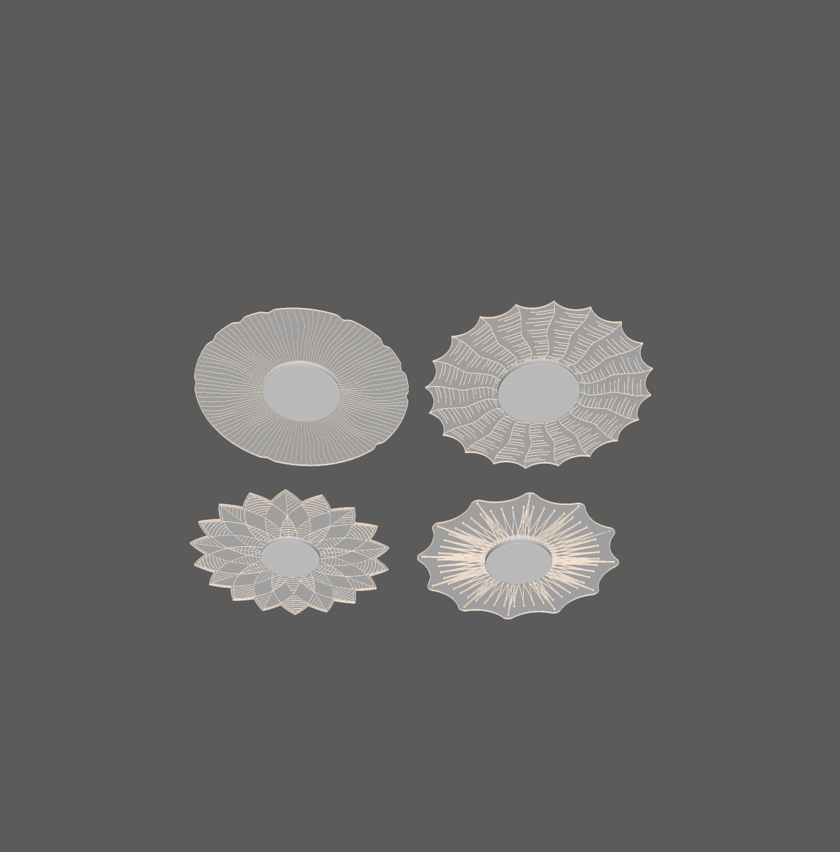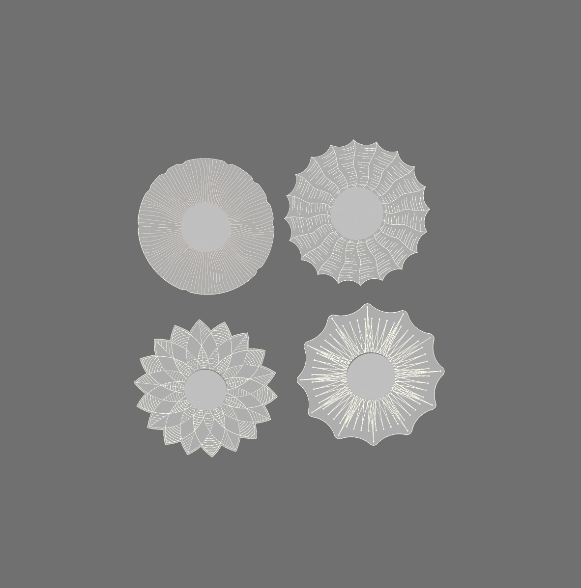 Hình ảnh mô tả một bộ sưu tập đèn trần gồm bốn mẫu đèn được thiết kế tinh xảo với các đường nét hoa văn nghệ thuật khác nhau. Mỗi chiếc đèn có cấu trúc dạng tròn, trung tâm là một đĩa tròn với ánh sáng lan tỏa ra xung quanh, tạo cảm giác nhẹ nhàng và sang trọng.