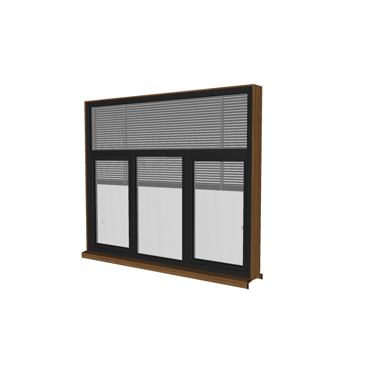 Hình ảnh thể hiện một cửa sổ đa năng được làm từ vật liệu nhôm kính chất lượng cao, mang lại vẻ đẹp hiện đại và đảm bảo độ bền. Khung cửa màu đen sang trọng, kết hợp cùng màu gỗ ấm áp của viền, tạo nên cảm giác vừa mạnh mẽ vừa gần gũi. Cửa sổ được chia làm ba phần, với các ô cửa lớn giúp tối ưu hóa ánh sáng tự nhiên vào không gian.