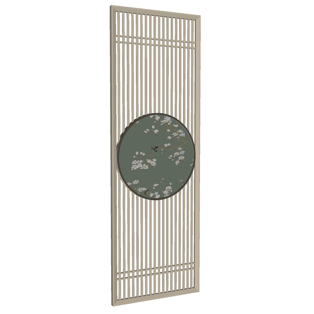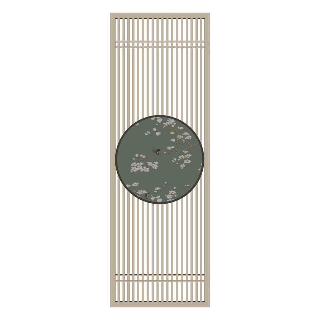 Bức vách nổi bật với thiết kế theo phong cách tối giản nhưng không kém phần tinh tế với cấu trúc thanh mảnh và màu sắc nhẹ nhàng. Kết cấu chính của bức vách là các thanh kim loại thẳng đứng sắp xếp đường nét cân đối, tạo ra sự nhẹ nhàng và hiện đại. Phần tâm điểm nằm ở giữa với một hình tròn lớn có hoạ tiết hoa đào nhã nhặn — một sự kết hợp hoàn hảo giữa truyền thống và hiện đại.