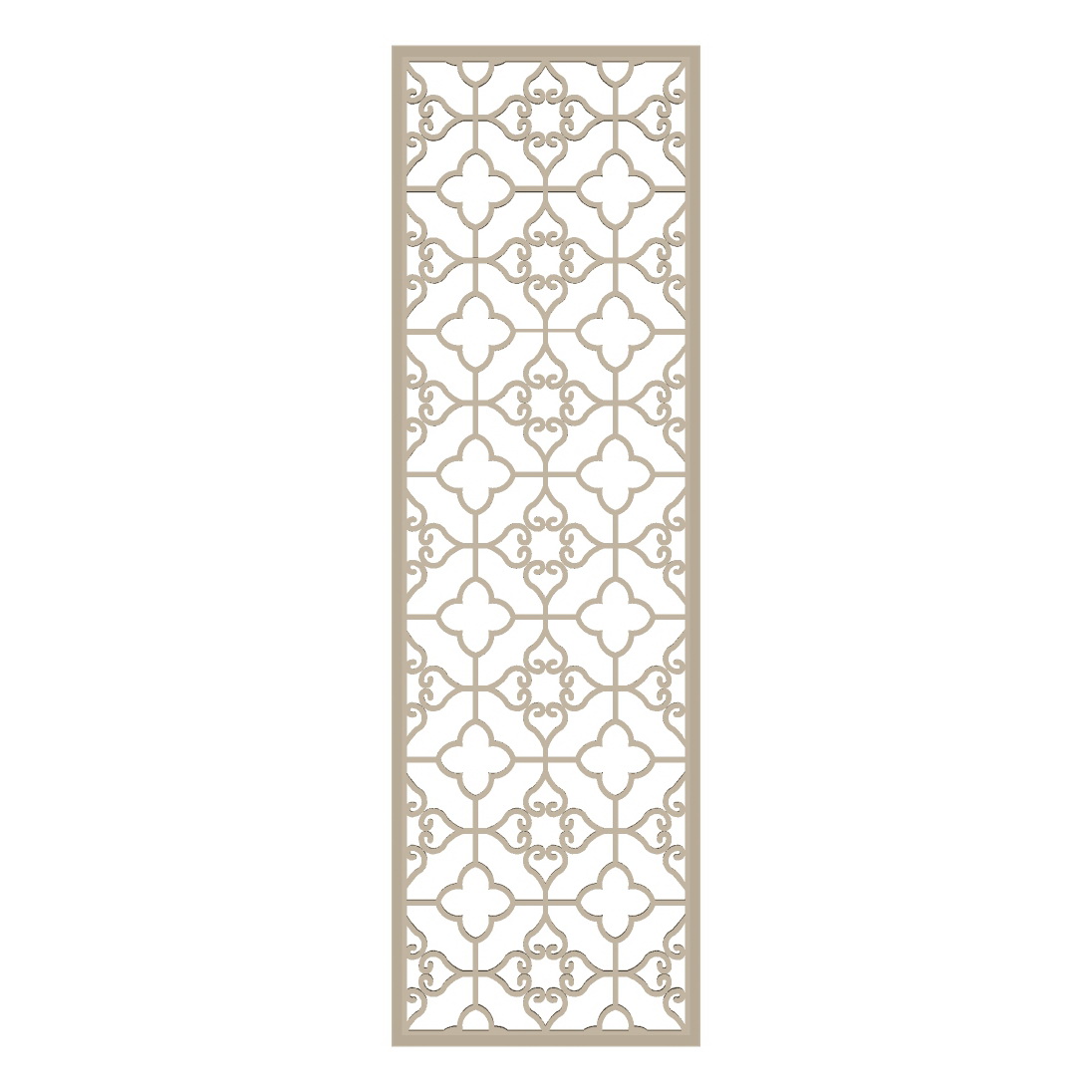 Hình ảnh đại diện cho mẫu hoa văn trang trí được chế tác tinh xảo từ kim loại với thiết kế đối xứng, tạo nên vẻ đẹp hiện đại và sang trọng. Các đường nét được chăm chút tỉ mỉ, biểu hiện qua các hoa văn hình học lặp đi lặp lại, làm nổi bật sự cân đối và hài hòa. Hai phiên bản màu sắc khác nhau, một ánh vàng và một màu trắng kem, mang đến sự lựa chọn đa dạng cho các phong cách thiết kế khác nhau.