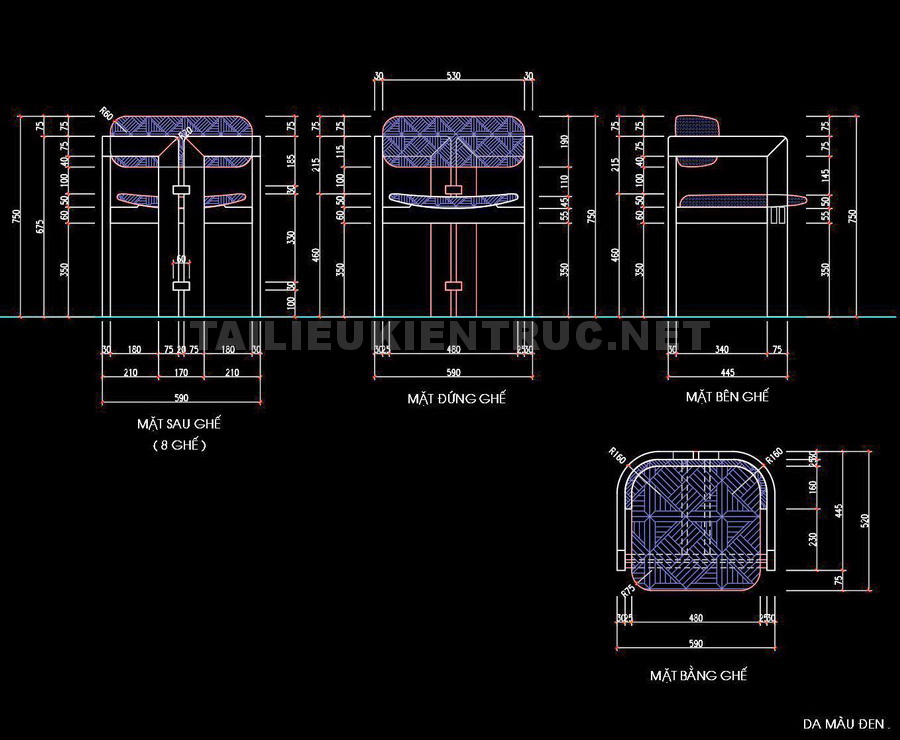 Trong tài liệu, hình ảnh minh họa từng chi tiết của chiếc ghế, từ mặt trước, mặt bên cho đến mặt đứng. Các bản vẽ đều được thể hiện rõ ràng, với tỷ lệ và kích thước cụ thể, giúp người dùng dễ dàng nắm bắt thông tin cần thiết.
