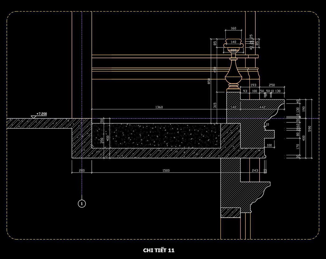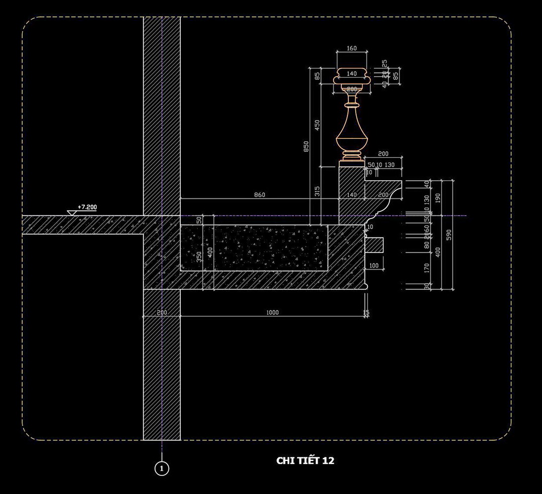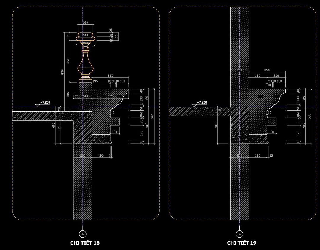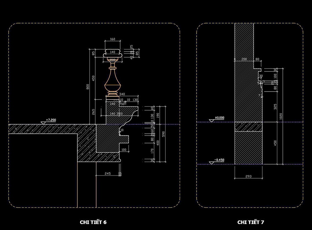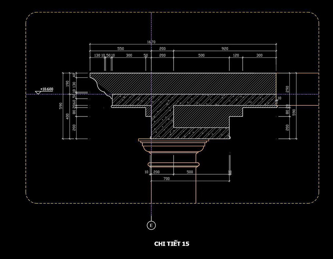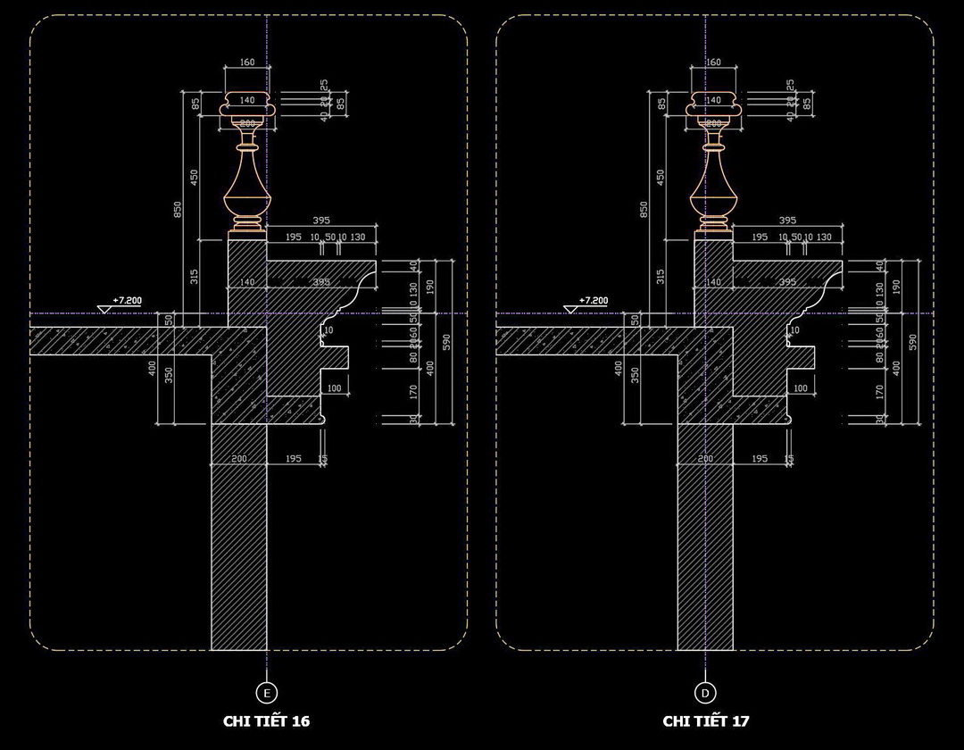 Chi tiết kỹ thuật bao gồm kích thước chính xác của từng phần, giúp dễ dàng trong việc đặt vật liệu và thi công. Tài liệu cung cấp thông tin về cả chiều cao, chiều rộng và độ dày, đảm bảo việc kiến tạo và lắp đặt diễn ra suôn sẻ.