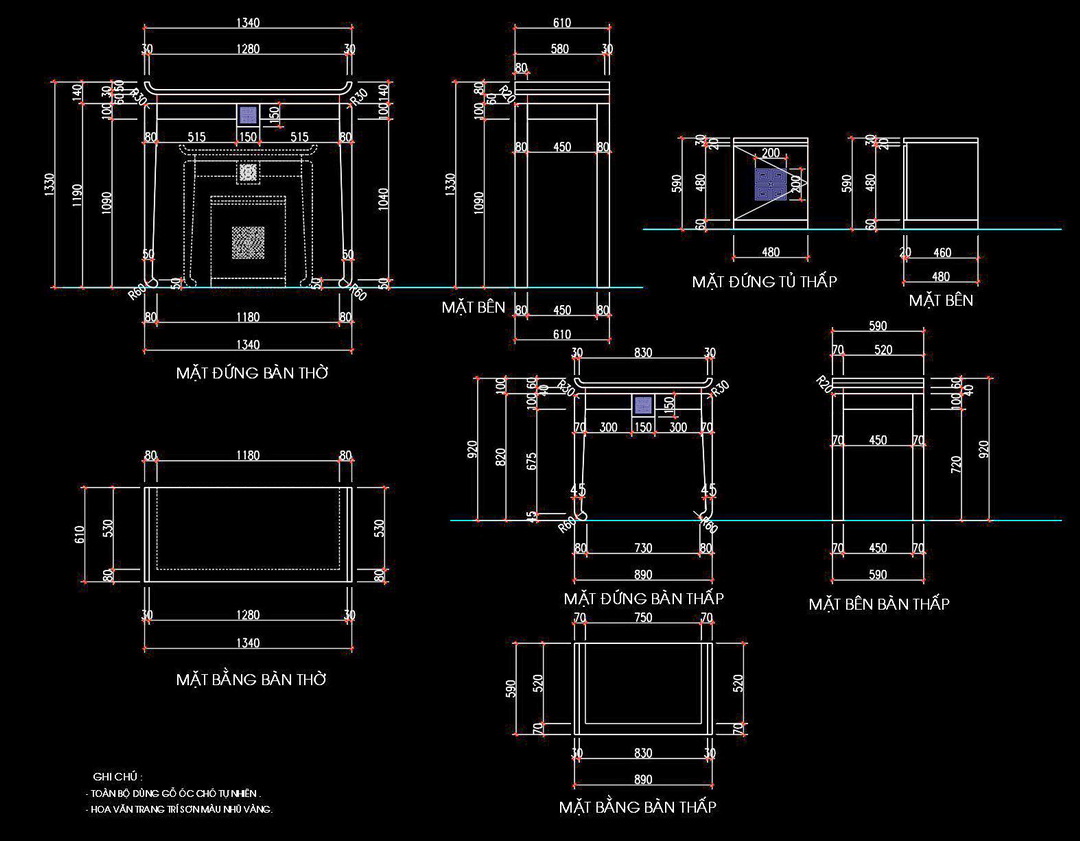 Tài liệu này cung cấp bản vẽ chi tiết về cấu trúc và kích thước của các kiểu bàn thờ và tủ thờ. Nó cung cấp một cái nhìn toàn diện về thiết kế và các chi tiết kỹ thuật cần thiết cho việc chế tác và lắp đặt sản phẩm này.