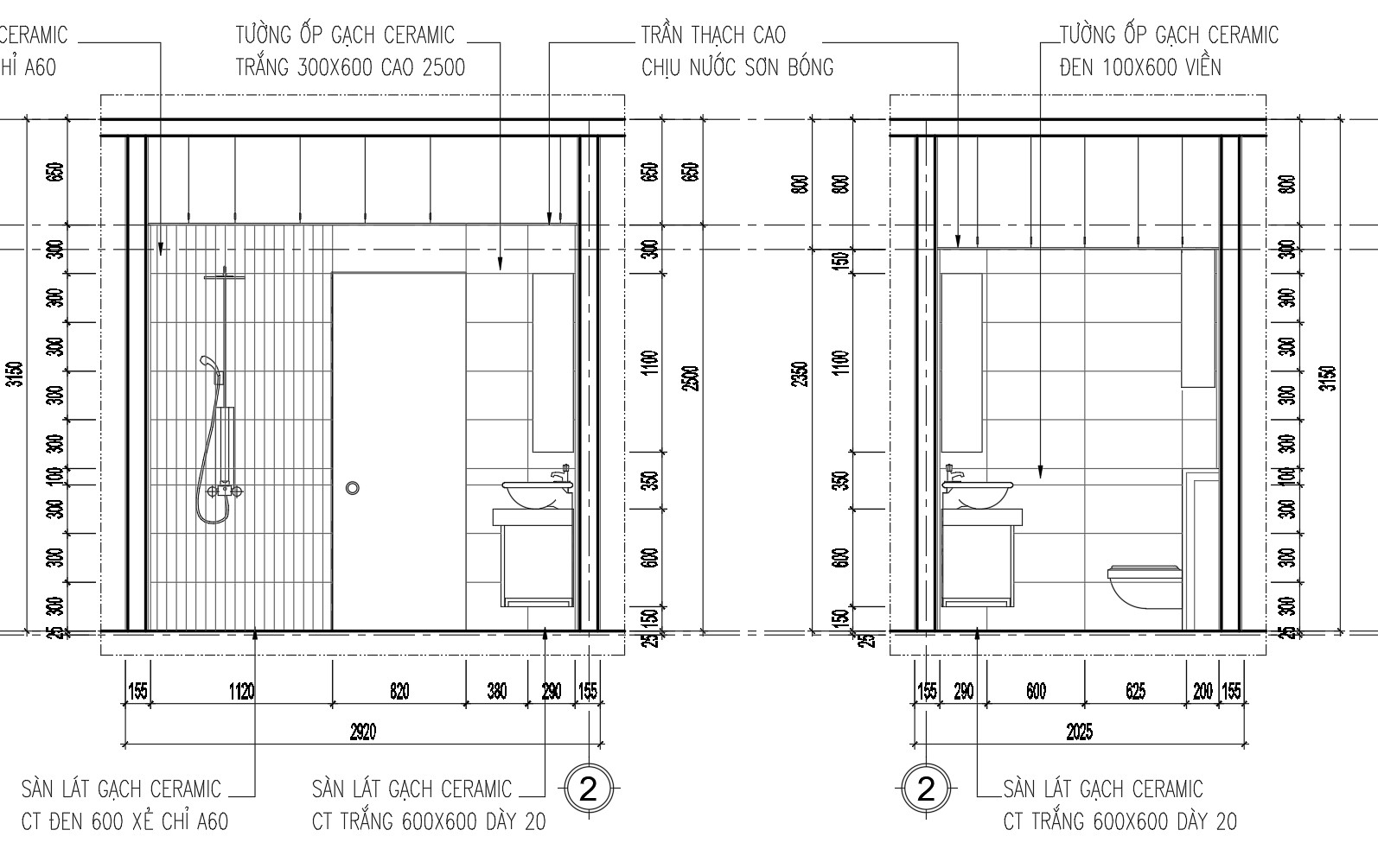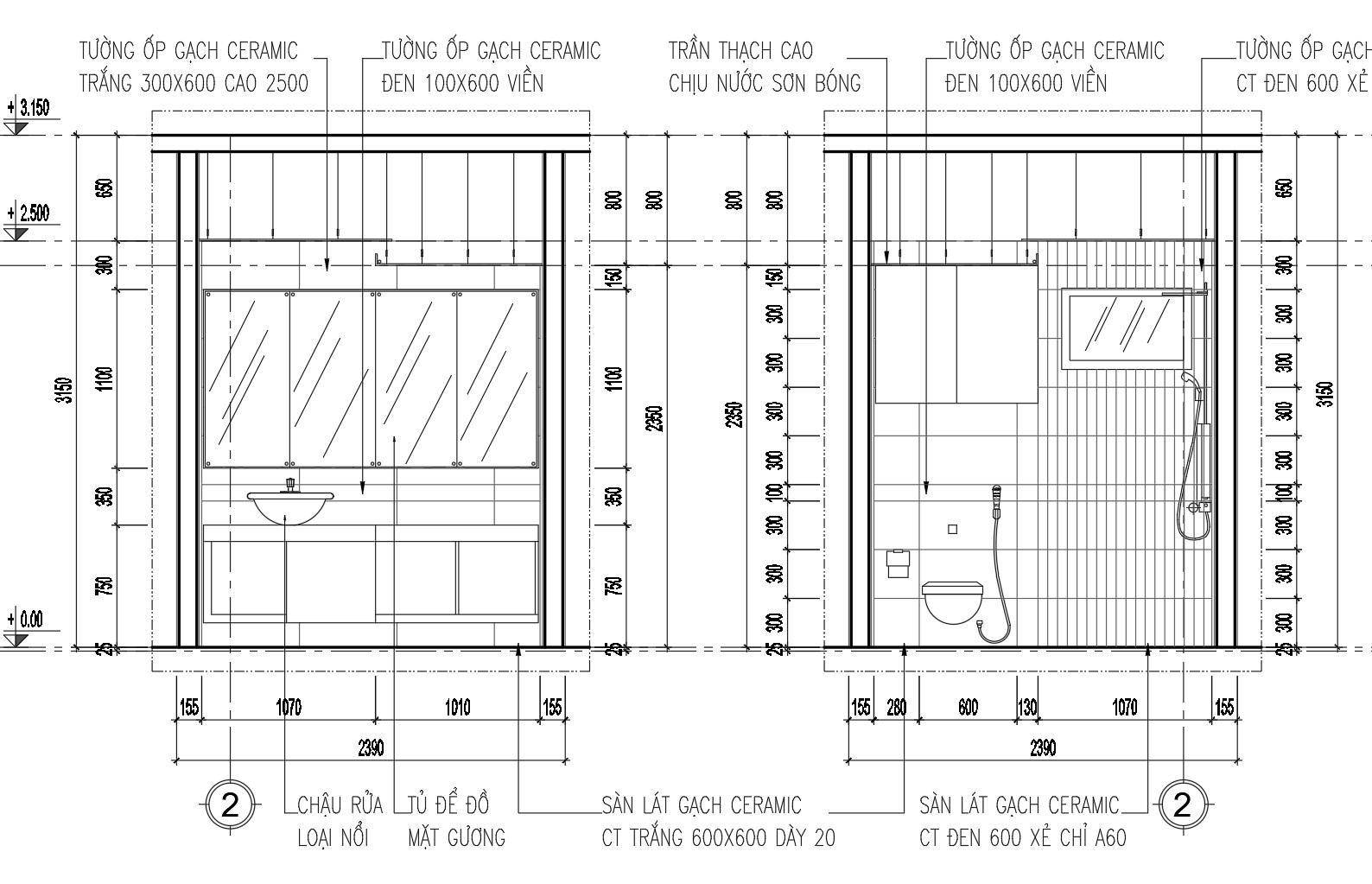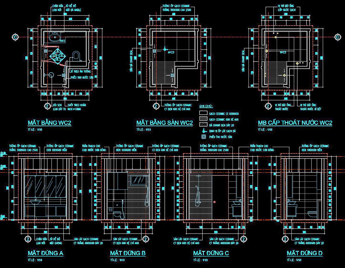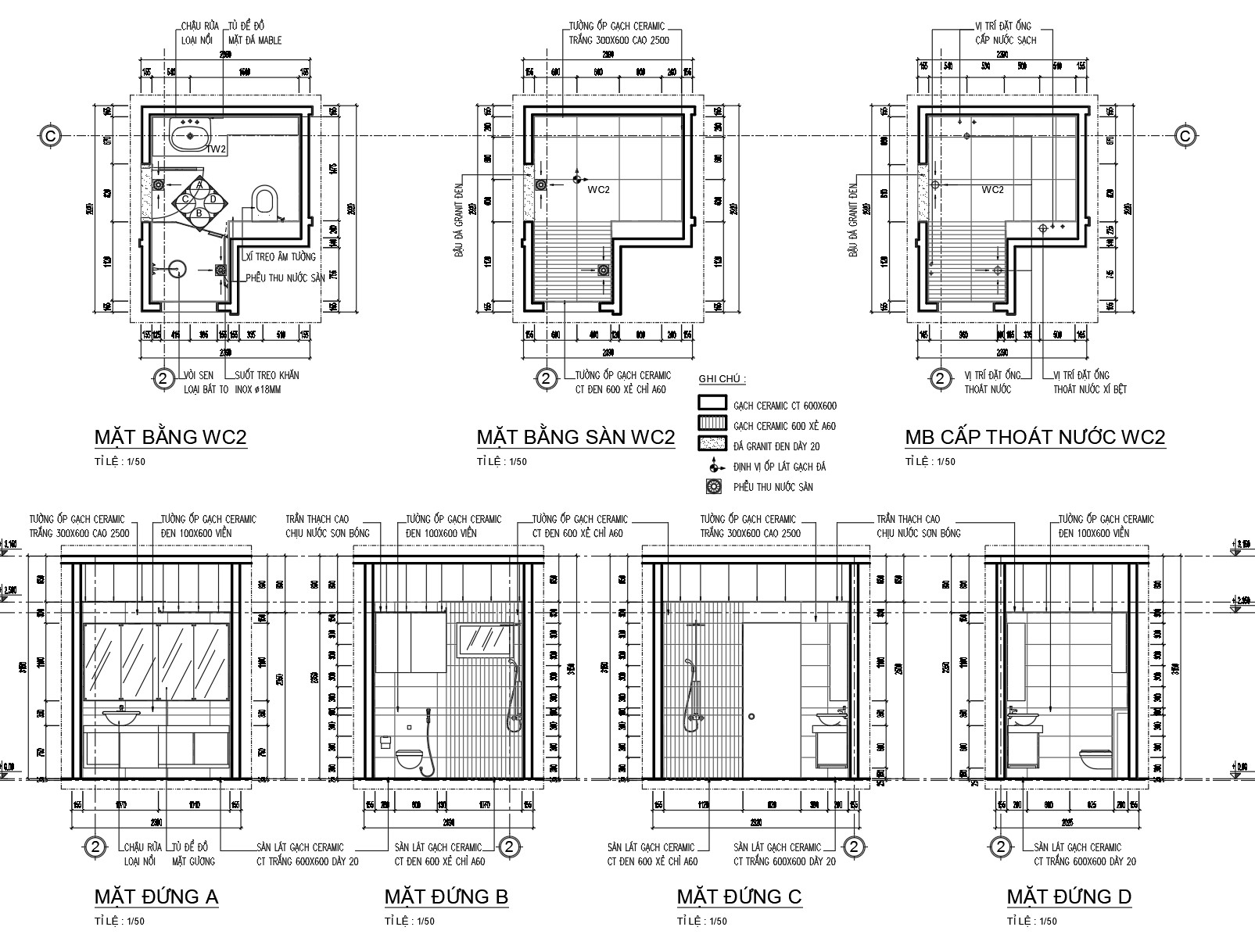 Bản vẽ chi tiết này bao gồm các mặt bằng và các mặt đứng của phòng vệ sinh. Mỗi mặt được thiết kế tỉ mỉ và rõ ràng, giúp dễ dàng hình dung không gian thực tế. Nó cung cấp các thông số kỹ thuật chi tiết và bố trí các thiết bị vệ sinh như bồn cầu, bồn rửa và vòi sen.