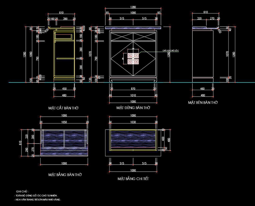 Hình ảnh trên thể hiện chi tiết từng góc độ của bàn thờ, bao gồm mặt cắt, mặt đứng và mặt bên. Mỗi phần được đánh dấu kích thước cụ thể, chỉ ra từng phần tử của thiết kế một cách rõ ràng. Các đường nét tinh tế, sắc nét, chính xác giúp người xem dễ dàng tưởng tượng và thực hiện theo.
