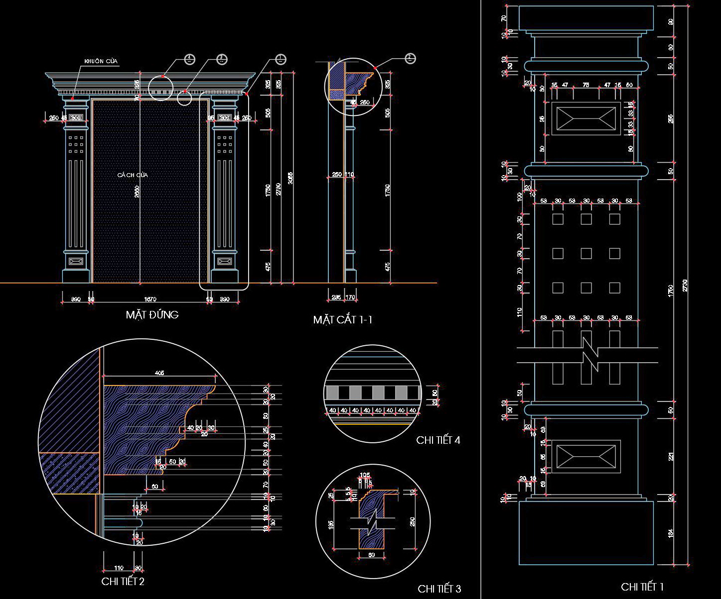 Các hình ảnh trên minh họa phần cửa và các chi tiết phụ trong bản vẽ kỹ thuật số, bao gồm cả mặt đứng, mặt cắt và các phân đoạn chi tiết. Bản vẽ hiển thị đầy đủ các thông số kích thước, từ độ dài, chiều cao đến chi tiết đường viền, cho phép người đọc hiểu rõ từng phần cấu trúc.