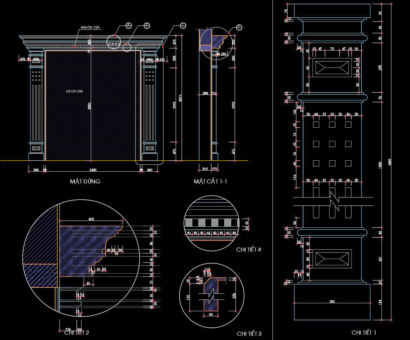Bản vẽ cho thấy thiết kế cửa với các chi tiết rõ ràng, bao gồm mặt cắt và kích thước cụ thể của từng phần. Từ các đường nét tinh tế cho đến các thông số chi tiết, mọi thứ đều được thể hiện một cách rõ ràng và chính xác.