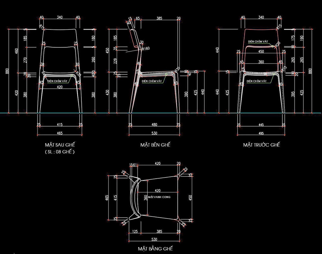 Các hình ảnh trên cho thấy những bản vẽ kỹ thuật của một chiếc ghế với các góc nhìn khác nhau như mặt trước, mặt sau, mặt bên và mặt bằng ghế. Bản vẽ chi tiết từng kích thước cụ thể giúp dễ dàng hình dung được hình dáng và cấu trúc của sản phẩm.
