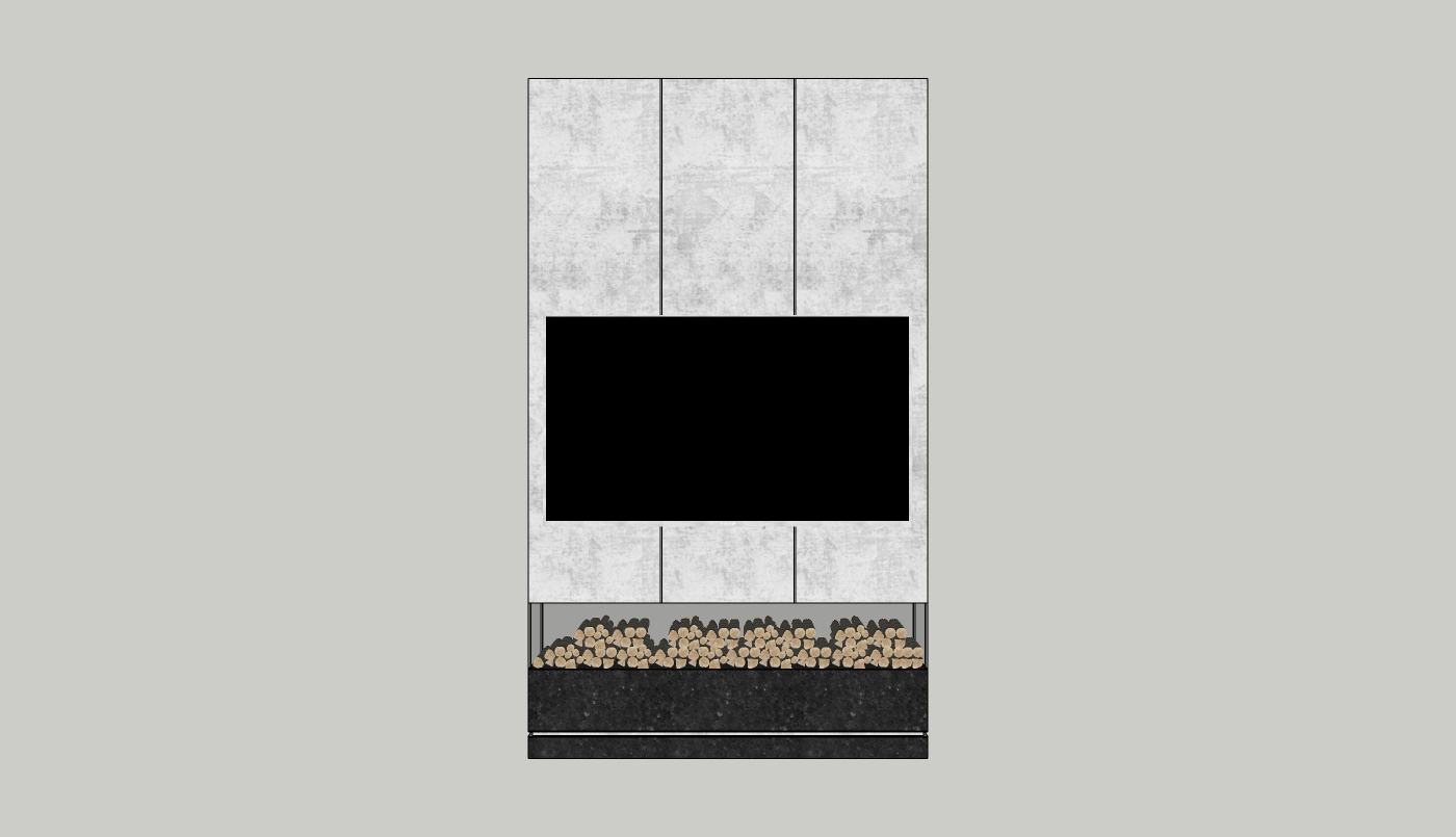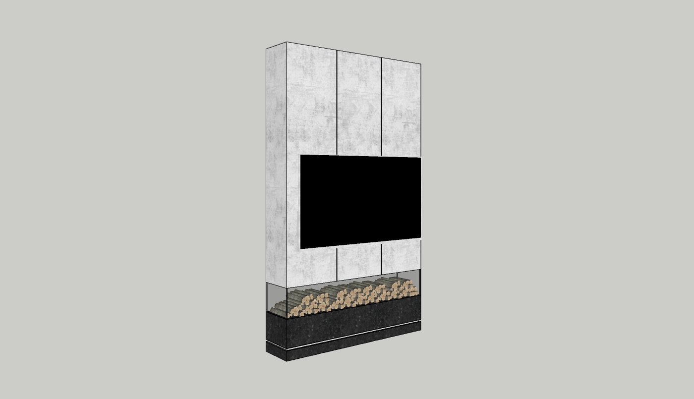 Thiết kế kệ tường này kết hợp giữa sự sang trọng và tính thực dụng. Với kiểu dáng tối giản, kệ có màu sắc chủ đạo là xám nhạt, mang lại cảm giác tinh tế và hiện đại. Khu vực trung tâm của kệ được trang bị màn hình lớn, tạo điểm nhấn công nghệ cao. Phía dưới màn hình là một ngăn chứa được xếp đầy củi với tạo hình khối vuông vức, hoàn thiện bằng vật liệu đen nhám, làm nổi bật sự mạnh mẽ, chắc chắn.