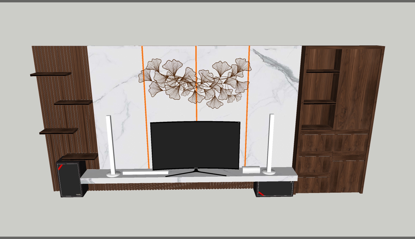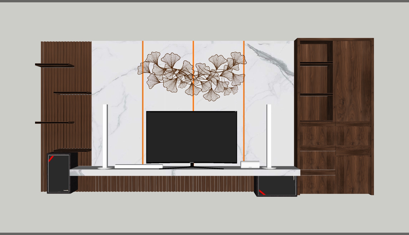 Thiết kế trong hình ảnh là một mẫu kệ tủ TV được làm từ vật liệu gỗ cao cấp và đá cẩm thạch, tạo nên một không gian sống sang trọng và hiện đại. Mẫu kệ này bao gồm nhiều ngăn kệ và hộc tủ tiện dụng để chứa đồ.