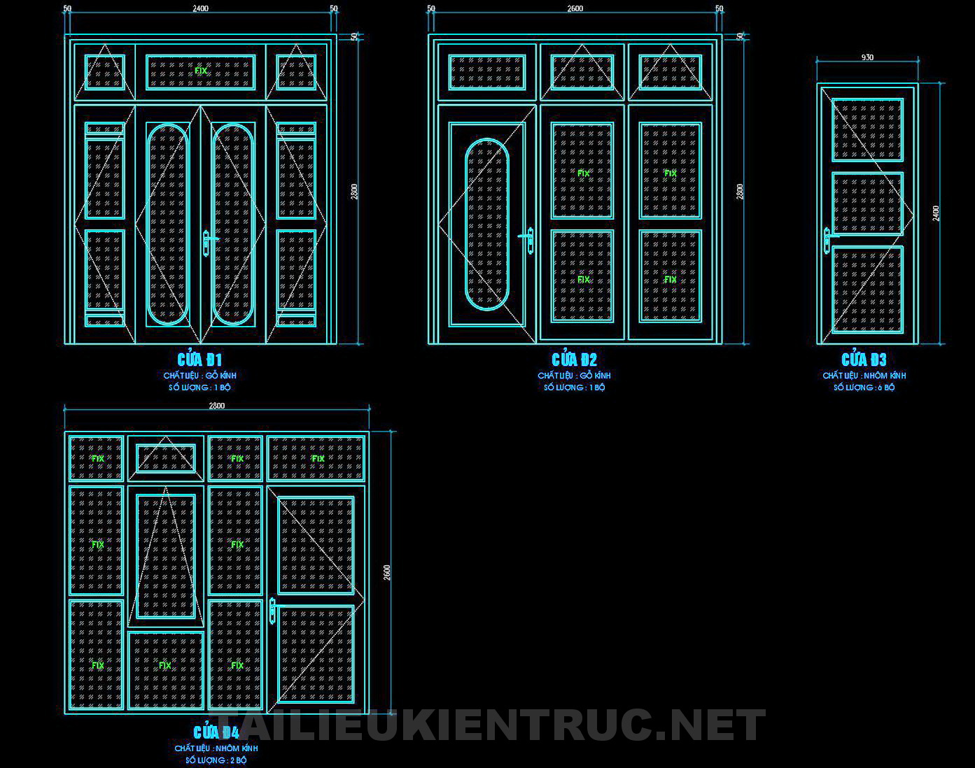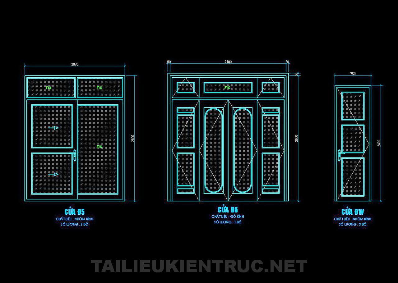 Tài liệu bao gồm các bản vẽ kỹ thuật chi tiết của nhiều loại cửa khác nhau với các kích thước và kiểu dáng đa dạng. Các bản vẽ này được thể hiện rõ ràng với các thông số kỹ thuật cụ thể như chiều rộng, chiều cao và vật liệu sử dụng. Điều này giúp cho việc lựa chọn và phối hợp trong thiết kế kiến trúc trở nên dễ dàng và chính xác hơn.