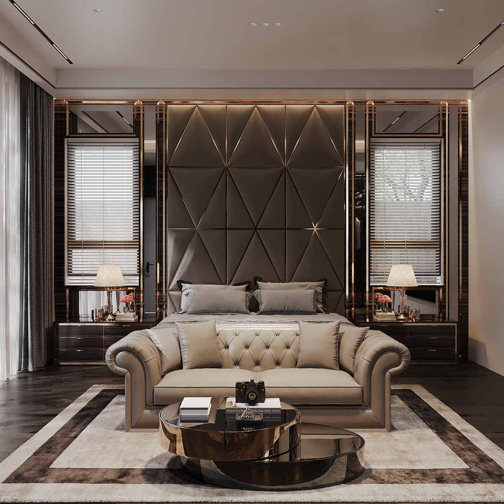 Phòng ngủ được mô tả trong hình ảnh thứ hai là một không gian đậm chất sang trọng và thanh lịch, với giường ngủ lớn được bố trí trung tâm, phần đầu giường thiết kế với thanh kim loại đậm chất nghệ thuật. Bộ ga trải giường và gối cùng tông màu tạo ra cảm giác hài hòa, nhẹ nhàng. Hai chiếc đèn bàn symmetrically đặt trên hai bên giường thêm ánh sáng ấm áp, làm cho không gian trở nên lôi cuốn và tạo bầu không khí thư giãn hoàn hảo.