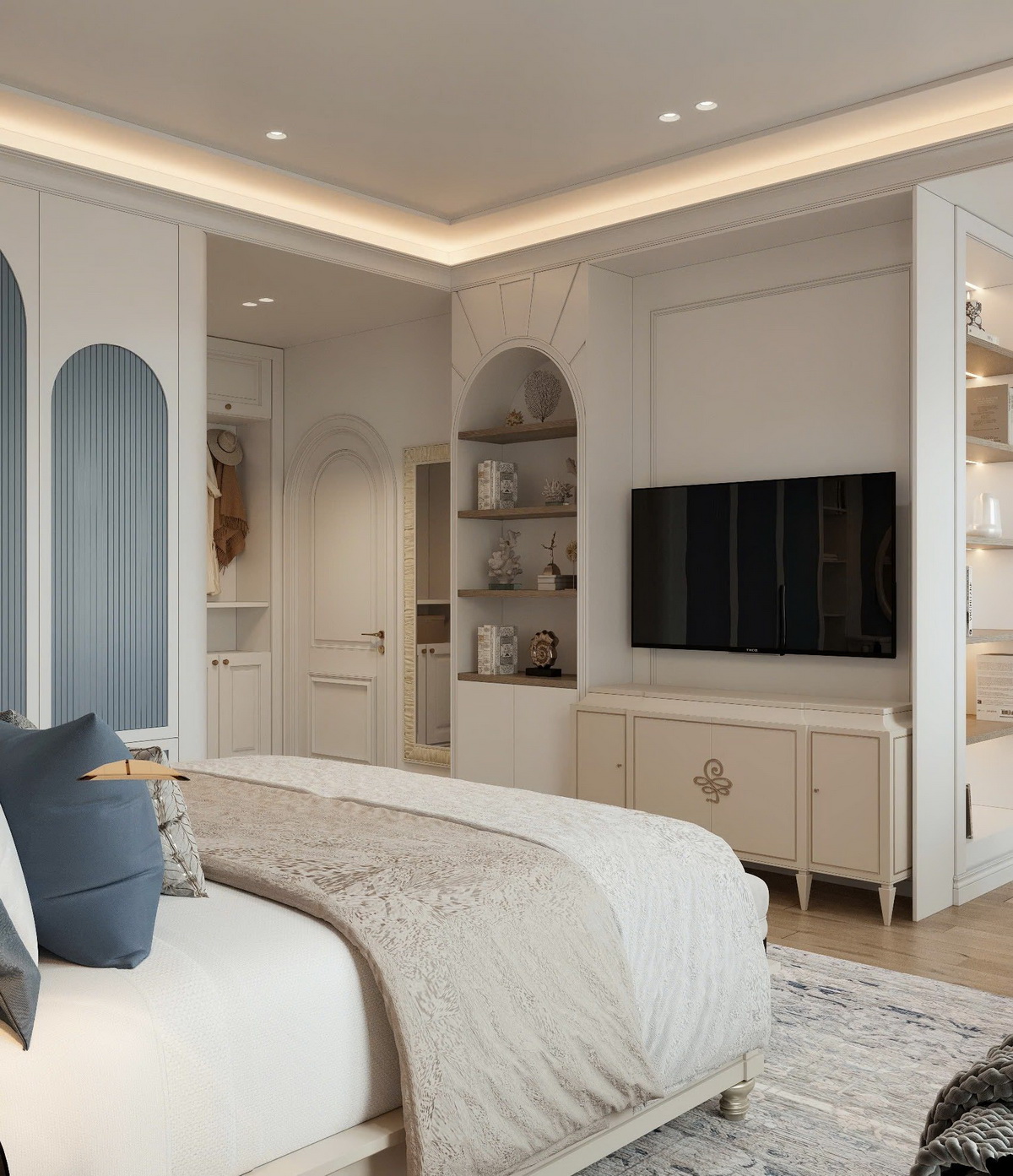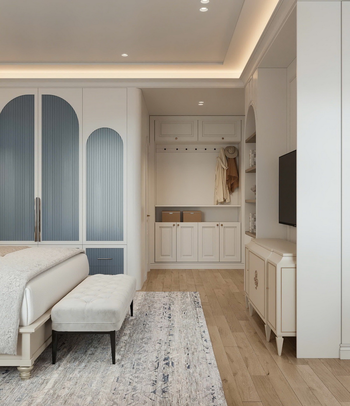 Phòng ngủ là một không gian quan trọng trong mỗi căn nhà, và thiết kế của nó không chỉ cần đẹp mắt mà còn phải tiện lợi và dễ sử dụng. Trong hai hình ảnh trên, phòng ngủ được thể hiện với phong cách sang trọng và ấm cúng, sự kết hợp hoàn hảo giữa màu sắc và bố cục nội thất.