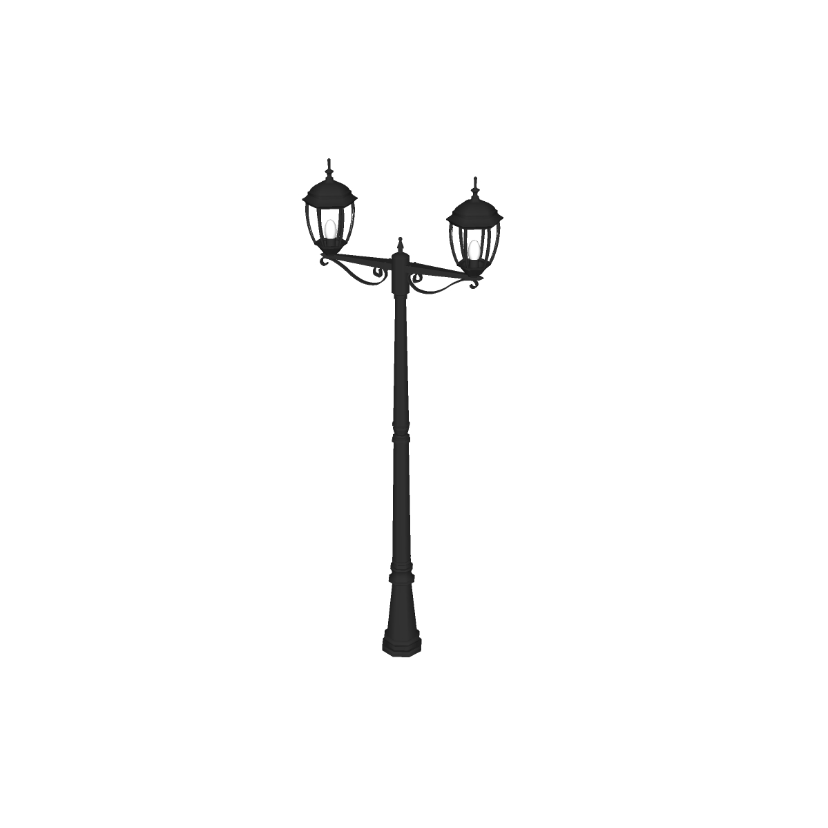 Hình ảnh miêu tả một mẫu đèn đường với thiết kế tinh tế, mang lại cảm giác sang trọng và bền bỉ. Mẫu đèn này được thiết kế với hai bóng đèn đối xứng, gắn trên một trụ đứng mạnh mẽ, phù hợp cho không gian đô thị, công viên và các khu vực cộng cộng khác.