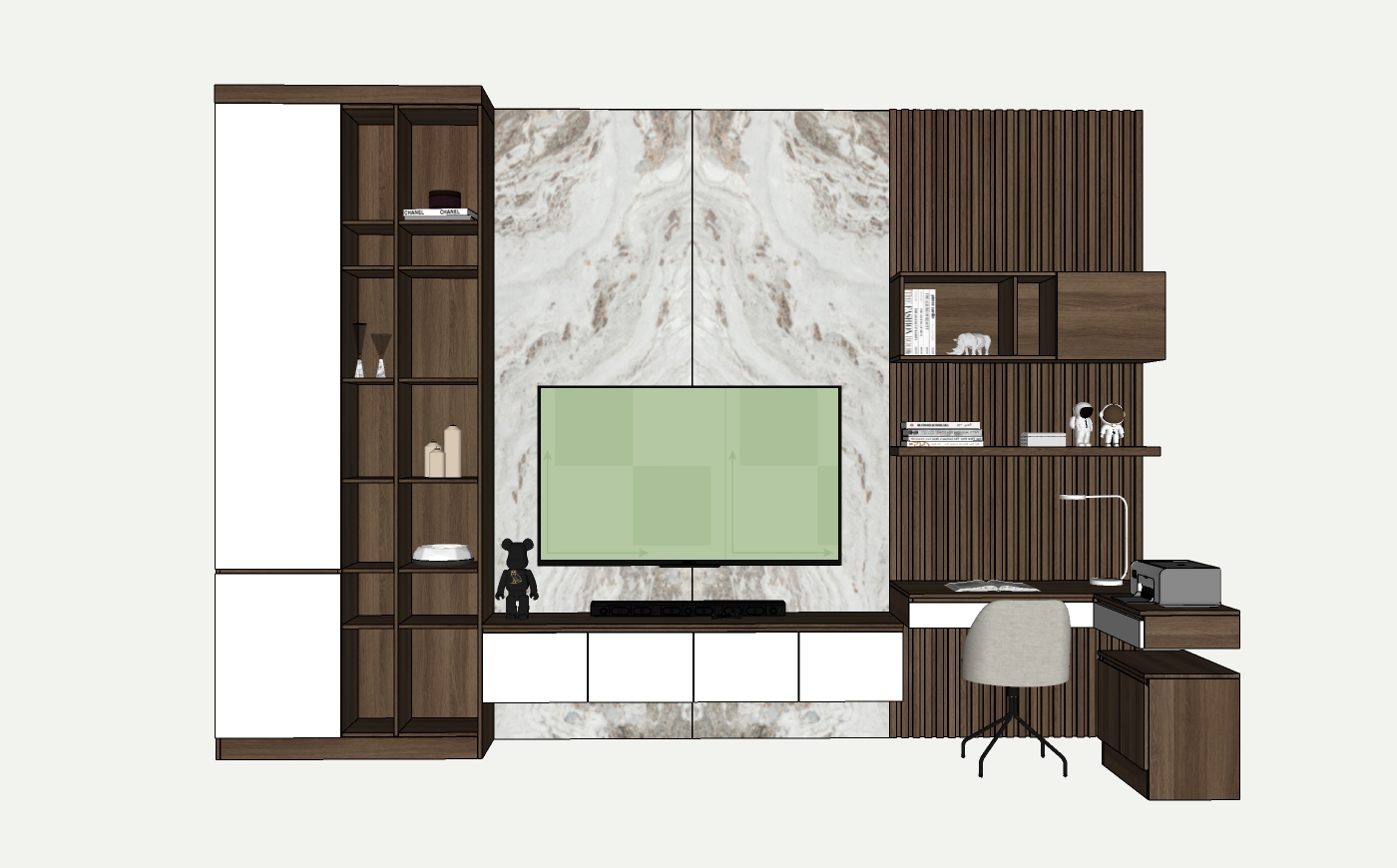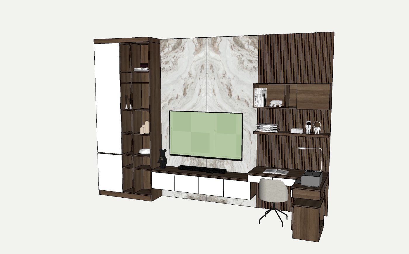 Các hình ảnh minh họa mô tả chi tiết một không gian nội thất bao gồm kệ sách, tủ chứa đồ, và khu vực làm việc kèm theo một tivi màn hình lớn. Đáng chú ý là sự kết hợp giữa các vật liệu như gỗ và bề mặt hoa cương nhân tạo, tạo nên vẻ ngoài độc đáo và thời thượng.