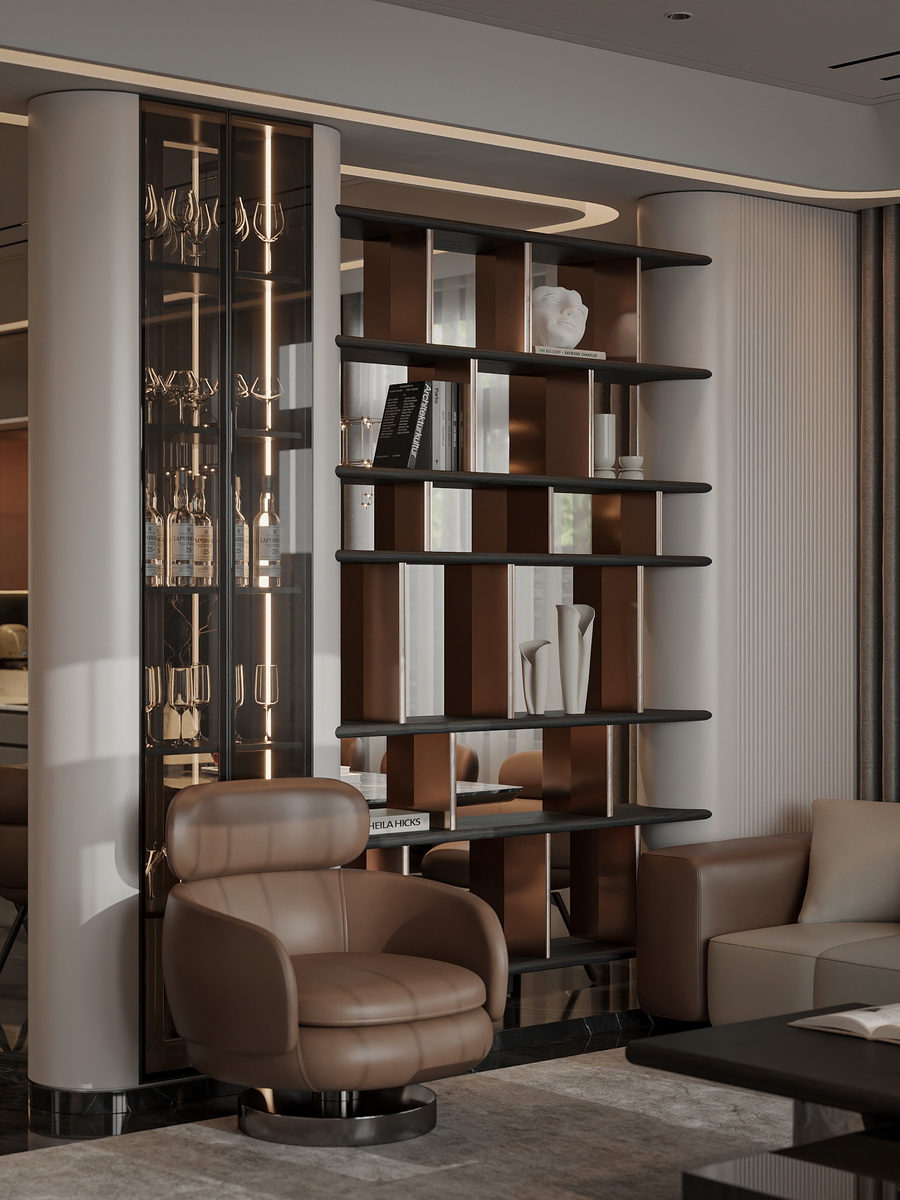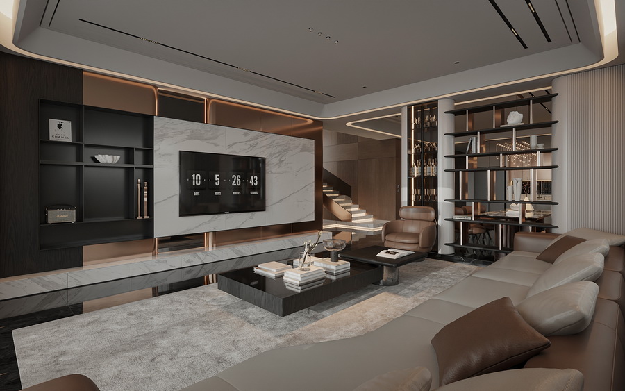 Không gian phòng khách được thiết kế với sự ưu tiên dành cho sự thoải mái và thẩm mỹ. Các vật dụng nội thất như ghế sofa, bàn trà, kệ sách đều có cấu trúc rõ ràng, sử dụng vật liệu cao cấp như gỗ, đá cẩm thạch và kim loại mạ. Ánh sáng cũng được bố trí hợp lý để tăng thêm phần lung linh cho khu vực sinh hoạt.