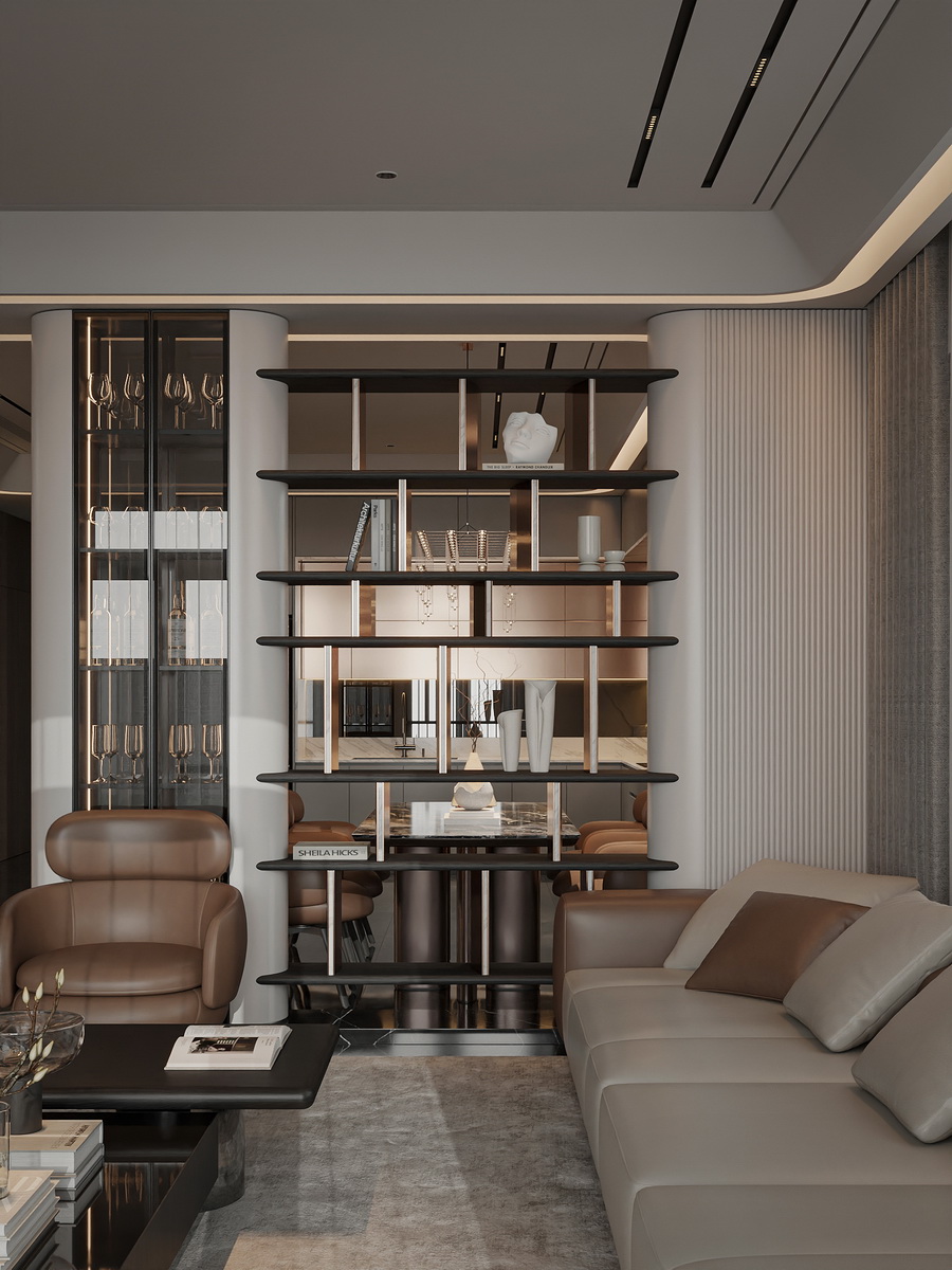 Bộ ảnh minh họa một phòng khách rộng rãi và sang trọng, sử dụng màu sắc trung tính kết hợp với các chi tiết ánh kim, tạo cảm giác hiện đại và cao cấp.